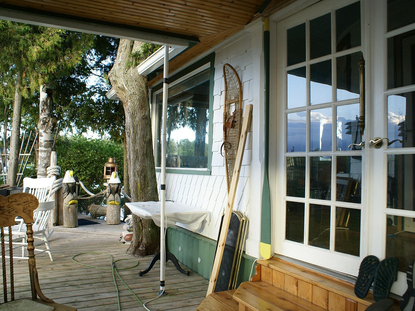 This porch entryway features rustic wooden flooring with a natural grain, complemented by a whitewashed bench and a green accent wall. Glass-paneled doors reflect the serene surroundings, creating an inviting transitional space. Decor elements include vintage snowshoes and wooden paddles, adding a nostalgic touch. Natural light pours in, further enhancing the bright atmosphere. Traditional wooden rocking chairs and whimsical totem-like decorations invite relaxation. Surrounding greenery provides privacy and a connection to nature, while the overall aesthetic reflects a charming blend of classic Americana and comfortable outdoor living. Practical elements, like a garden hose, suggest an active outdoor lifestyle.