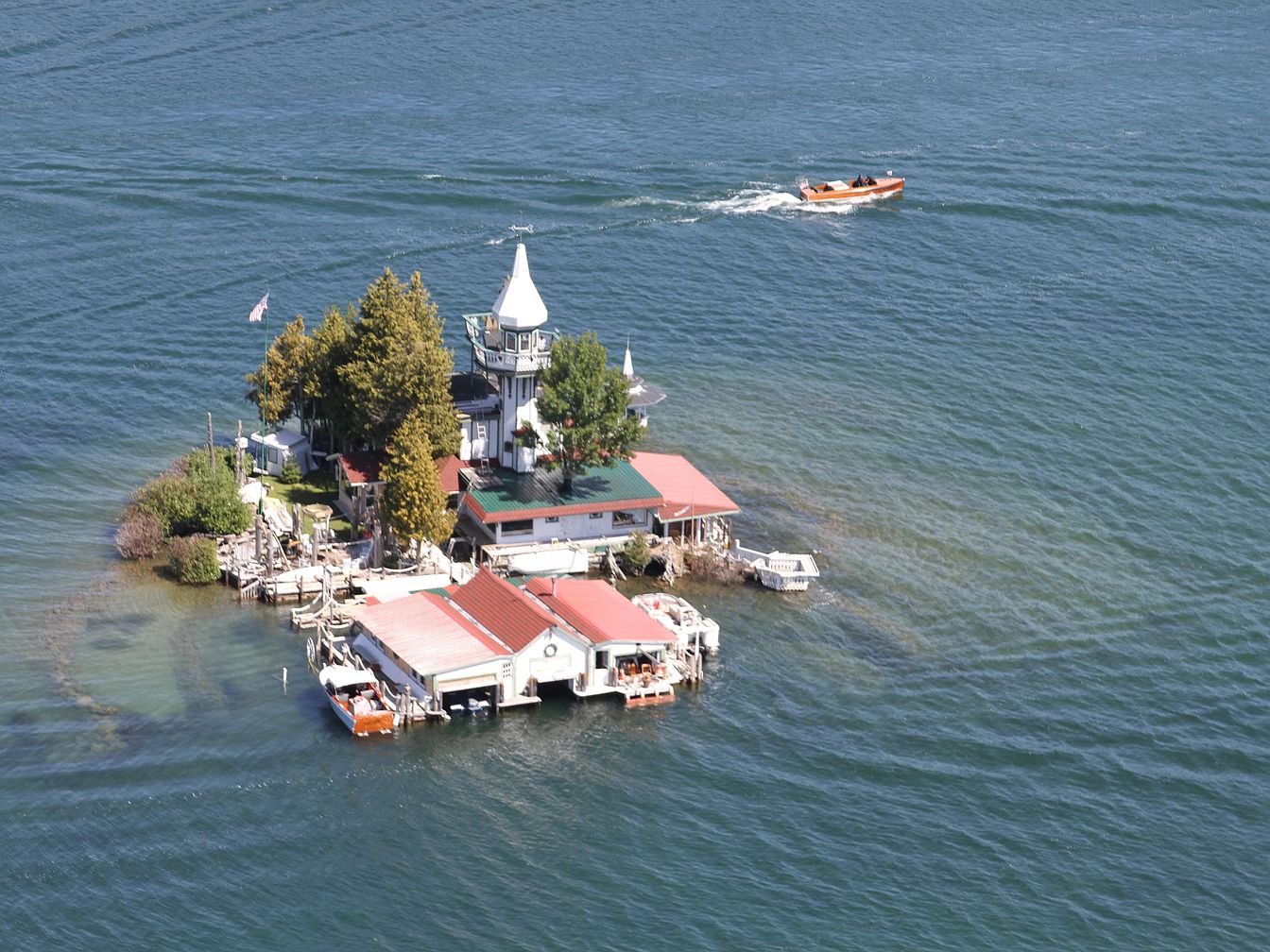 An aerial view of a charming lakeside retreat featuring a unique architectural structure with a tall pointed tower accented by a balcony. The property is surrounded by shimmering blue water with gentle ripples, creating a serene atmosphere. Various trees around the building add lush greenery, contrasting nicely against the vibrant red roofs. Additional structures, including boat garages and docks, are visible, emphasizing a nautical theme. A speedboat glides across the water, hinting at recreational activities available nearby. The arrangement of buildings showcases an inviting layout, ideal for relaxation and enjoyment in a picturesque setting.