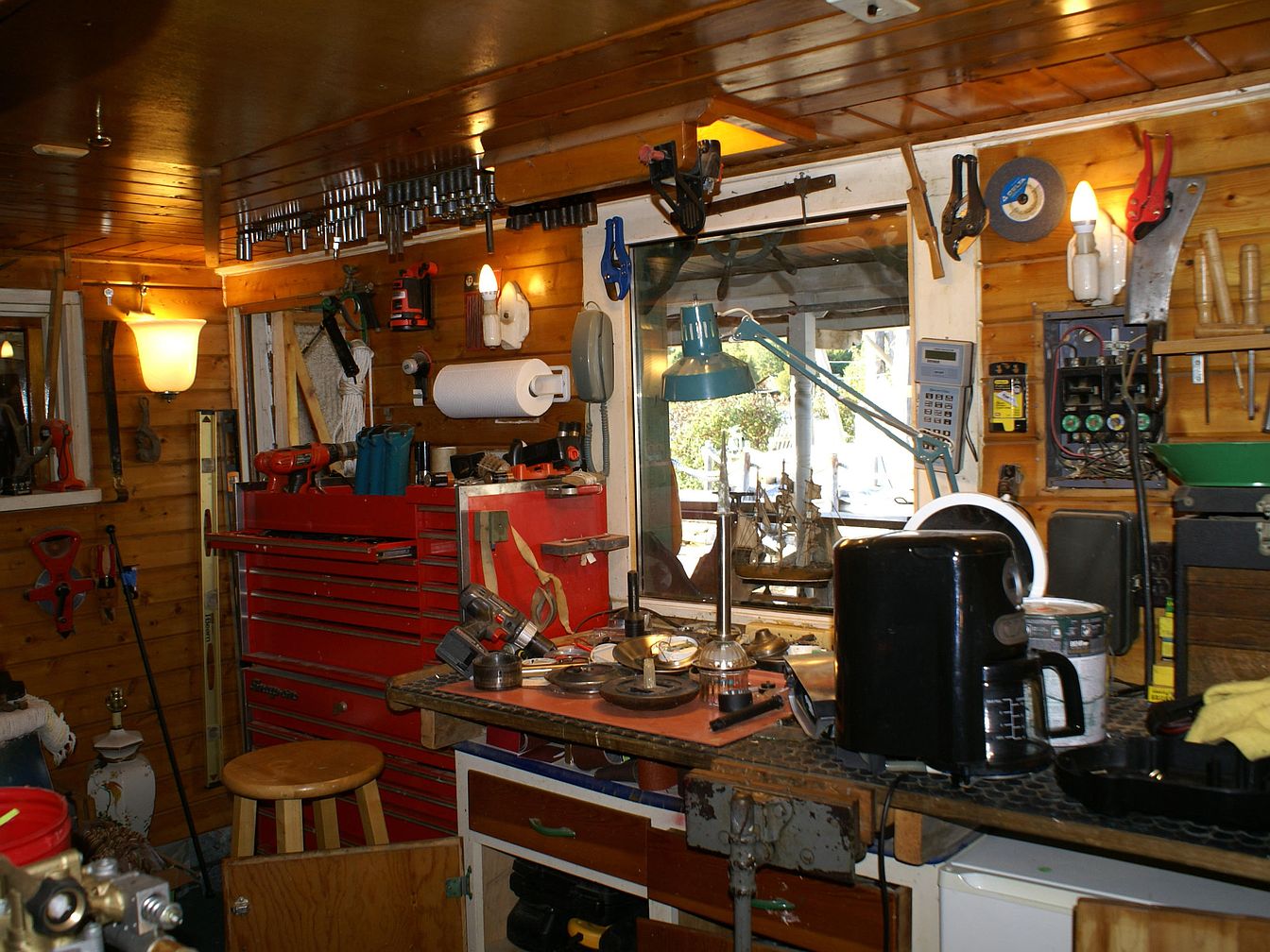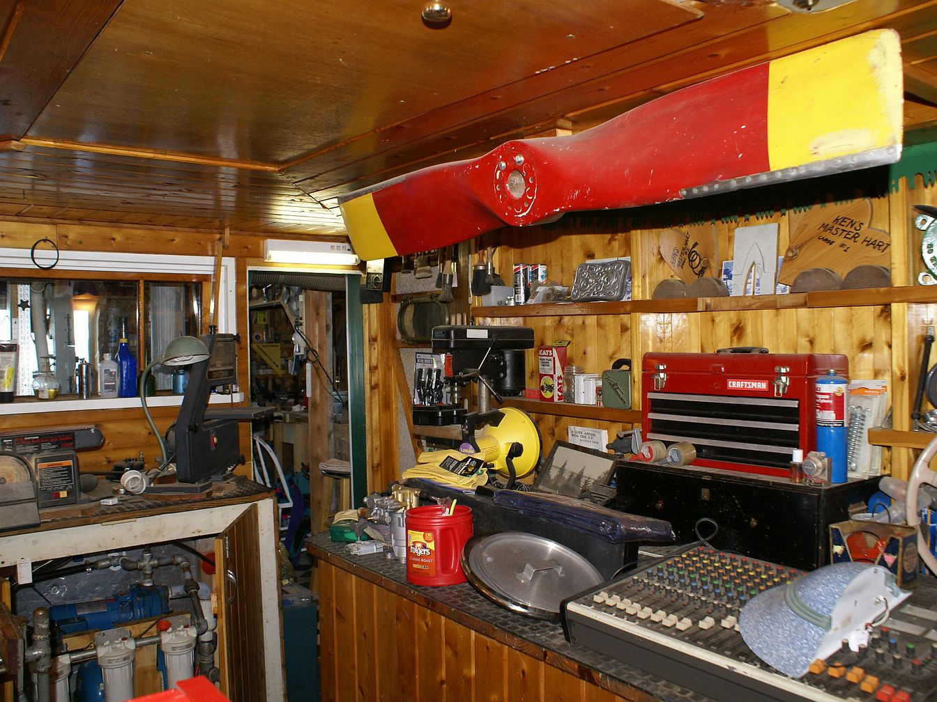 This workshop showcases a warm wooden interior, rich with natural tones from the polished wooden walls and ceiling. Tools and equipment clutter the counters, illustrating a space dedicated to craftsmanship. A yellow and red propeller hangs overhead, adding a unique focal point. Various containers and tools, like a red tool chest and a record player, are neatly arranged, hinting at a well-used but organized environment. In the background, machinery and equipment are visible, suggesting a blend of functionality and creativity. The room conveys a rustic charm, balanced between order and the character of a maker’s haven.