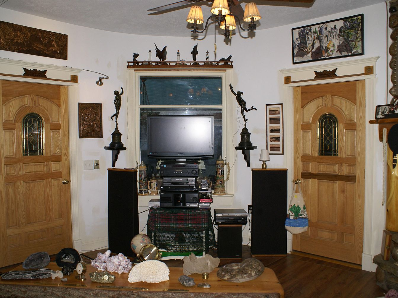 This cozy living room features a rounded layout with rich wooden doors and detailed glass accents. A central entertainment area includes a television flanked by vintage audio equipment and a decorative table adorned with various geological specimens. Above, a classic ceiling fan complements the warm wooden tones of the flooring and furnishings. Walls display eclectic art pieces, including a notable sculpture and framed artwork, adding character and charm. Soft lighting from an ornate chandelier illuminates the space, while a cohesive color scheme of browns and earthy hues creates a welcoming atmosphere for relaxation and gathering.