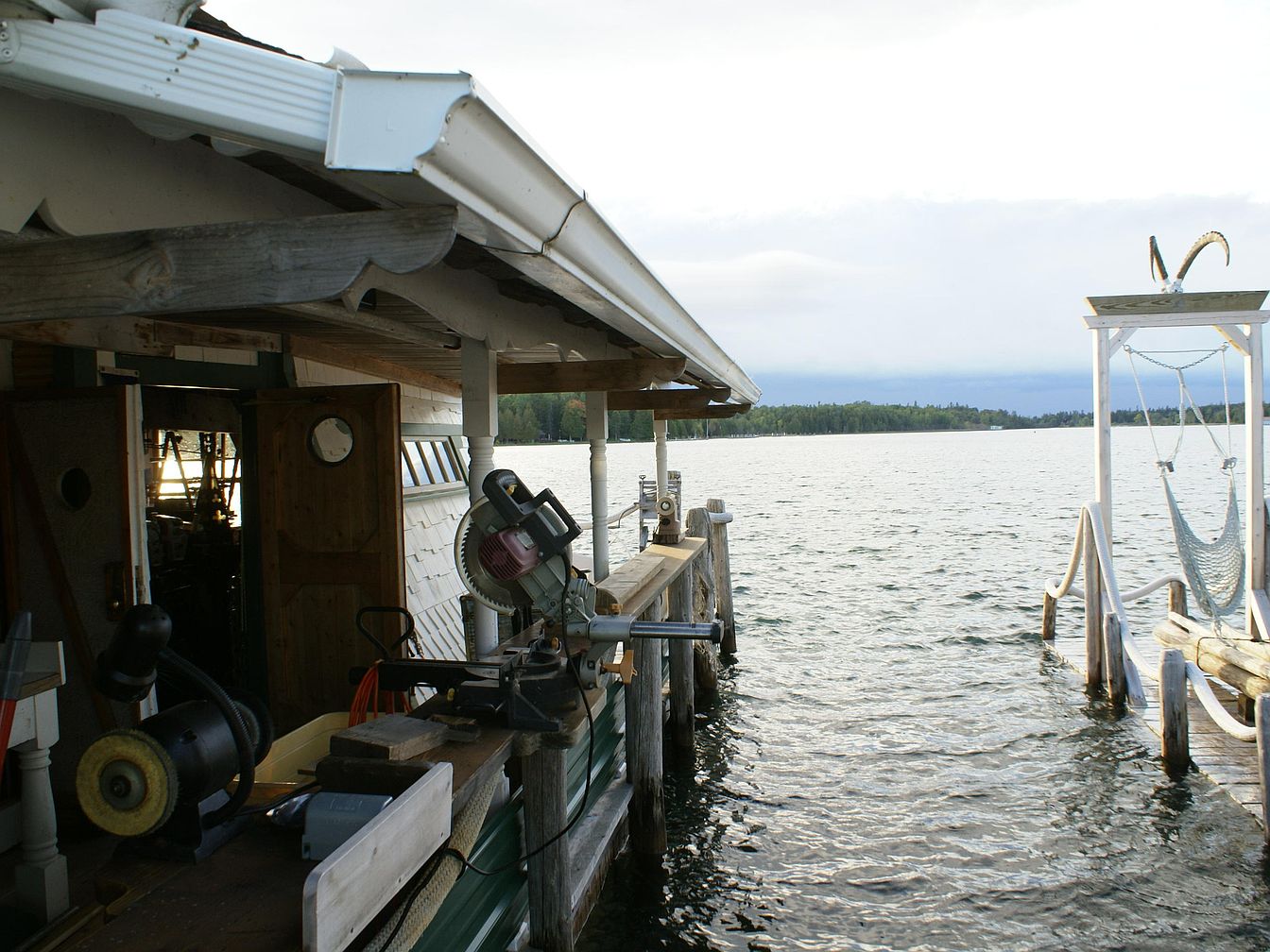 This image shows a cozy, rustic workshop by the water, featuring a sloped roof and wooden beams. The building has a weathered wooden façade, blending seamlessly with its natural surroundings. An open doorway reveals some tools and a round window that adds a charming touch. Various tools and equipment are visible on work surfaces, displaying a practical, lived-in aesthetic. Outside, a wooden dock extends into the shimmering water, with a hammock inviting relaxation. Lush, green trees line the horizon, enhancing the tranquil atmosphere and connection to nature.
