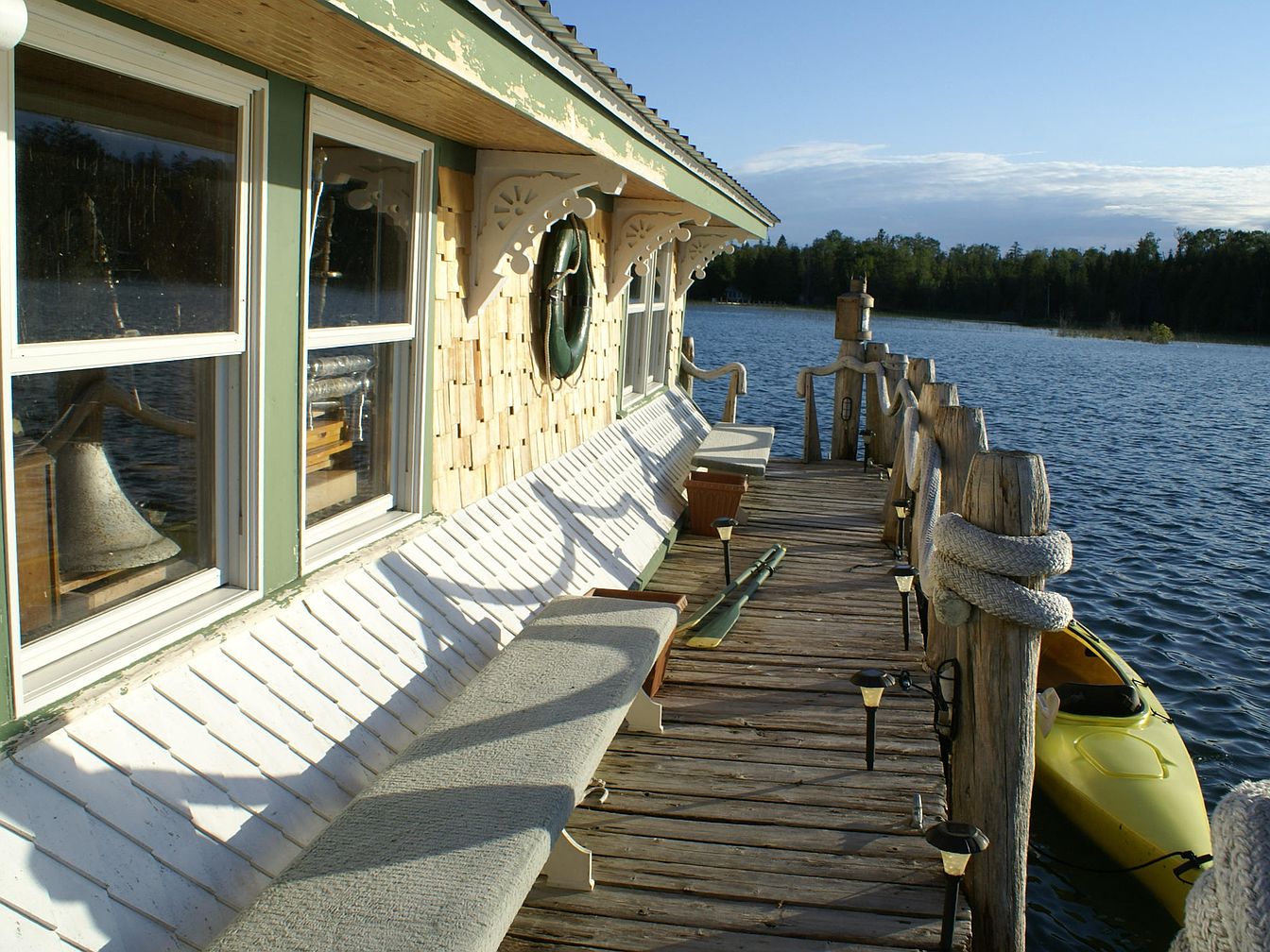 A wooden dock extends into serene waters, showcasing a blend of rustic charm and comfort. The weathered wooden planks create a natural aesthetic, complemented by a variety of seating arrangements, including a long bench with soft, inviting cushions. Windows framed in green are seen beside a decorative life preserver mounted against a textured wooden wall, hinting at nautical themes. The dock features dim, atmospheric lights nestled in the ground, enhancing evening enjoyment. A kayak rests partially in the water, adding an element of adventure. This tranquil space invites relaxation while embracing its lakeside environment.