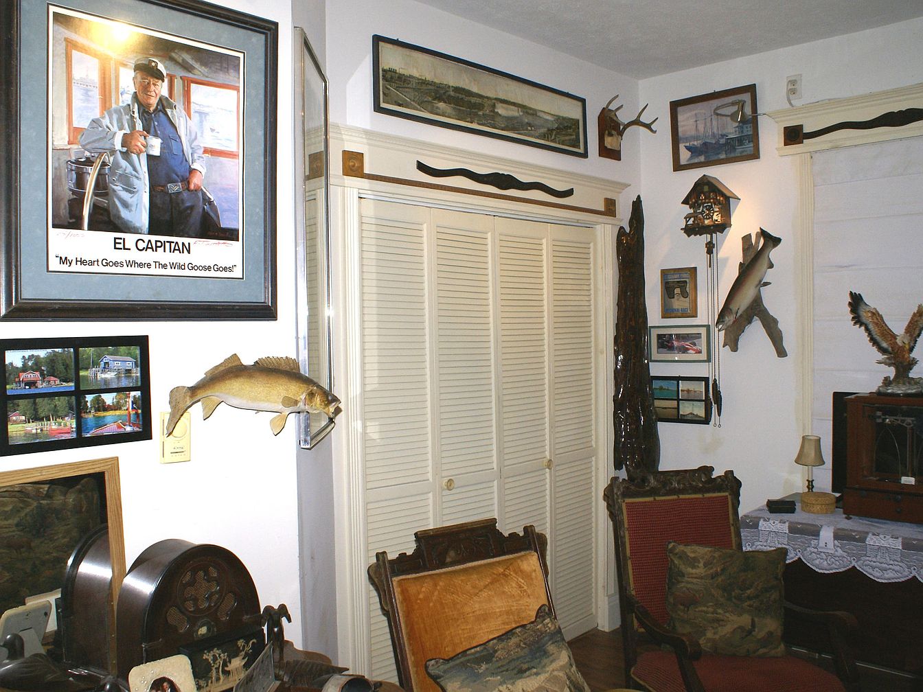 This cozy sitting room features a blend of vintage charm and rustic decor. A large framed portrait titled ‘El Capitan’ captures attention, surrounded by various fishing-themed memorabilia, including mounted fish and antlers. The color palette consists of warm earth tones, contributing to a welcoming atmosphere. Antique armchairs with intricate carvings sit across from a classic radio, highlighting the room’s nostalgic essence. A set of closed louvered doors provides storage, while framed pictures of serene lakes adorn the walls. The natural wood floor complements the overall aesthetic, creating an inviting space for relaxation and storytelling.