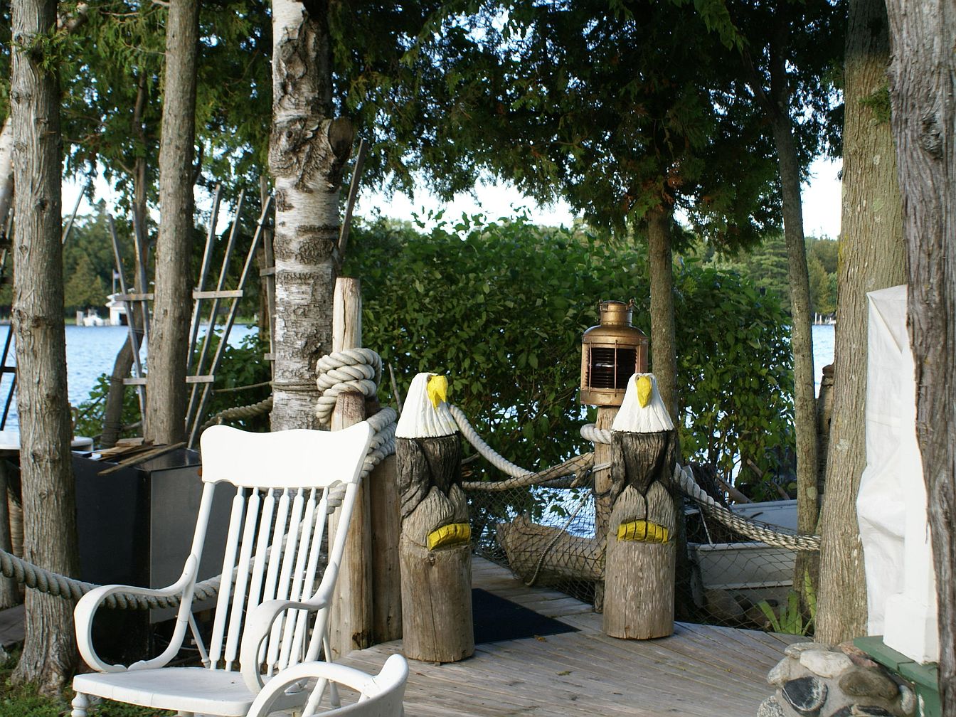 This outdoor deck area features rustic charm with natural wooden flooring and tall trees providing dappled shade. Two intricately carved eagle sculptures stand sentinel, showcasing artistry in weathered wood, each with striking yellow accents on their beaks. A white rocking chair invites leisurely moments, adding a touch of classic Americana. A lantern, crafted in vintage style, stands adjacent to the sculptures, suggesting warmth and nostalgia. The lush greenery in the backdrop, along with glimpses of water, enhances the serene atmosphere, making this space ideal for relaxation amidst nature’s beauty.