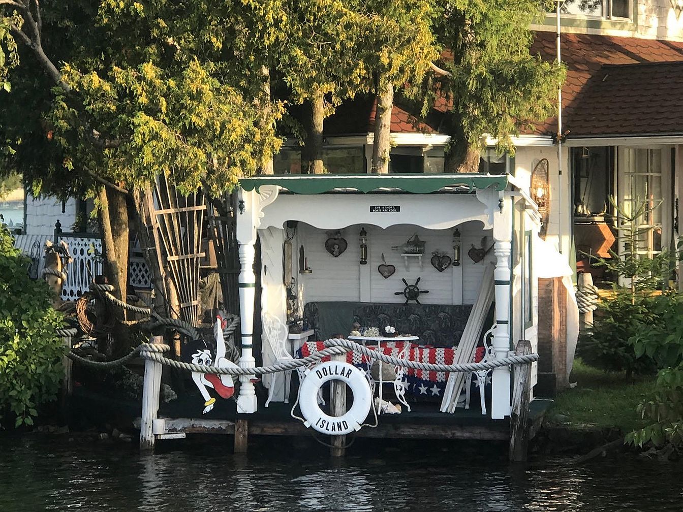 A charming waterfront cottage features a quaint sitting area adorned with a colorful, crocheted blanket draped over a vintage couch. Surrounding greenery adds a lush backdrop, while white decorative details and maritime-themed decor, including hearts and a ship’s wheel, enhance the nautical vibe. A lifebuoy labeled “DOLLAR ISLAND” hangs prominently, emphasizing the cottage’s playful charm. Wooden pillars and a shaded porch invite relaxation, complemented by white wicker chairs. The warm tones of the wooden structure contrast beautifully with the green foliage, creating a harmonious blend of rustic and whimsical aesthetics for a cozy lakeside retreat.