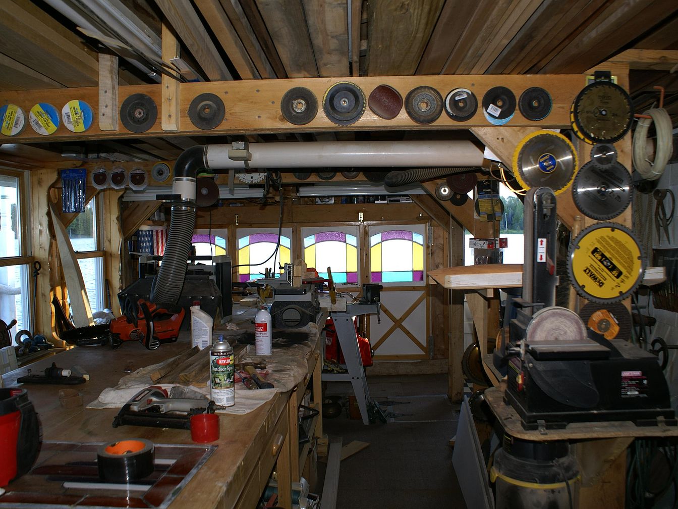This image presents a workshop featuring a rugged and functional design. The space is dominated by wooden beams and shelves displaying various tools and circular saw blades. Natural light floods in through windows adorned with stained glass, creating a colorful focal point. The workbench, cluttered with tools, materials, and containers, reflects an active woodworking environment. Multiple power tools are strategically placed, alongside a vacuum system for dust control. The color scheme consists of earthy tones with wooden textures, emphasizing a rustic yet industrious atmosphere. This workshop embodies creativity, craftsmanship, and practicality in its layout and aesthetics.