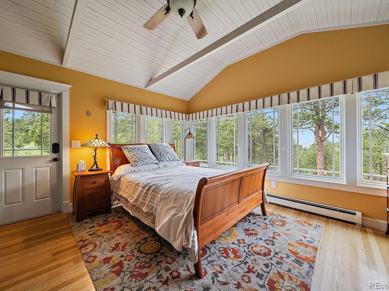 This cozy bedroom features a warm yellow wall that complements the rich wooden furniture. A queen-sized bed with a dark wooden frame is dressed in soft white linens and patterned throw pillows. Natural light floods the room through expansive windows lined with subtle striped valances, offering views of surrounding trees. A classic bedside lamp casts a warm glow on a stylish nightstand adorned with decor. The hardwood floor is enhanced by a colorful area rug featuring intricate floral designs, adding texture and visual interest. A charming wooden door gives access to the outdoors, enhancing the welcoming atmosphere.