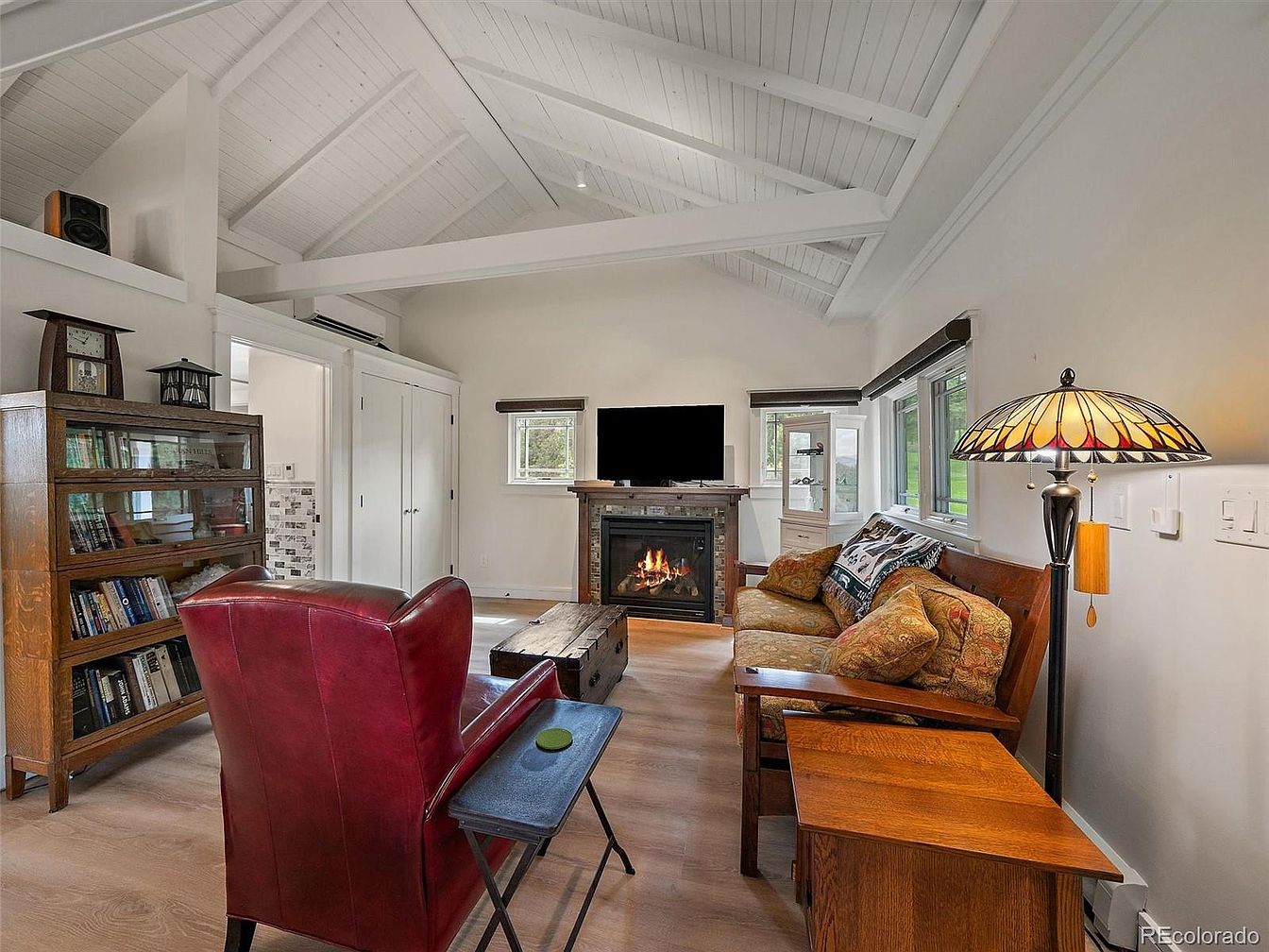 The living room features a stunning vaulted ceiling with exposed wooden beams, adding to the open, airy feel. A large, stylish sectional sofa in neutral tones is complemented by textured throw pillows. A sleek, rectangular coffee table sits in the center on light wooden flooring, enhancing the warmth of the space. The fireplace, with a vibrant tiled surround, serves as a focal point, while a flat-screen TV hangs above it. Natural light floods in through large windows, which frame views of surrounding greenery. Decorative elements include a coat rack, houseplants, and modern artwork, creating a cozy, inviting atmosphere.