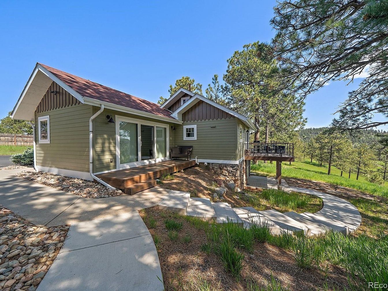 A charming outdoor patio area features a deck extending from the house, seamlessly integrating with the surrounding nature. The patio is constructed from warm wood, enhancing its inviting aesthetic. The house’s siding is a soft green, harmonizing with the lush landscape. Large sliding glass doors provide ample natural light and connect the interior with the outdoors. The gently curving concrete pathway, lined with smooth pebbles, invites exploration through the manicured garden. Background trees create a serene atmosphere, while the blue sky above adds a bright contrast, contributing to the peaceful, rustic vibe of this space.