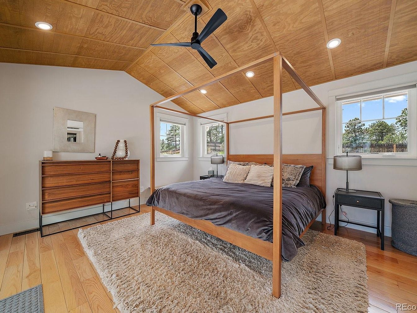 This bedroom features a warm, inviting atmosphere with natural wood elements. The centerpiece is a stylish four-poster bed, adorned with plush bedding in deep gray tones. A light-colored area rug adds texture beneath the bed, complementing the honey-toned hardwood floor. The ceiling is pitched, showcasing wood paneling that enhances the room’s rustic charm. To one side, a modern dresser with streamlined design offers ample storage, while a simple mirror above it reflects light. Two bedside tables flank the bed, each topped with understated lamps, creating a cozy reading nook by the windows that invite natural light.