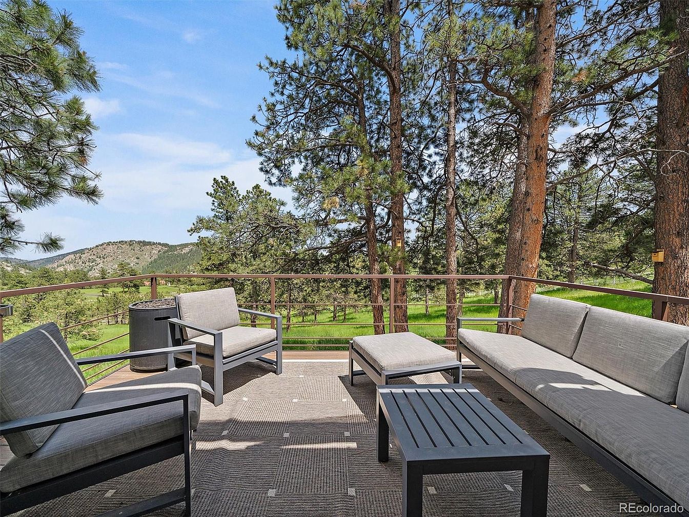 A spacious outdoor patio features a natural stone floor laid in a staggered pattern, enhancing rustic charm. At the center, a fire pit surrounded by plush black wicker chairs invites relaxation. Nearby, a small, round metal table complements the seating arrangement, perfect for casual dining or drinks. Strung overhead are decorative lights that add warmth to evening gatherings. The backdrop consists of lush green pine trees and rolling hills under a clear blue sky, creating a serene, tranquil atmosphere that connects indoor comfort with nature’s beauty. This space celebrates outdoor living seamlessly.
