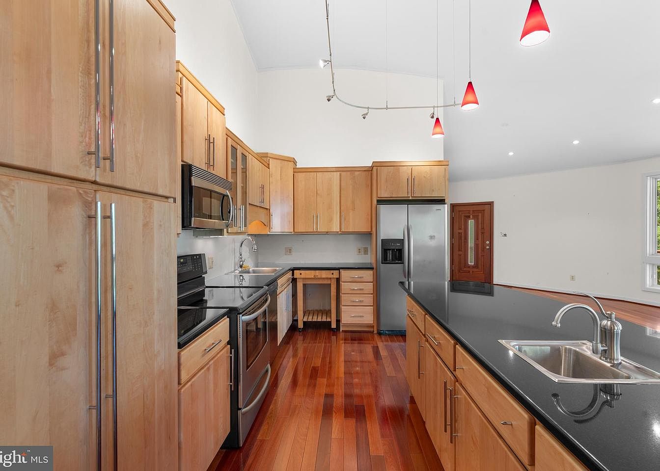 This modern kitchen features a sleek layout with light wood cabinetry neatly arranged along the walls. The countertops are a striking black, providing contrast against the warm tones of the wood. Stainless steel appliances, including an oven, microwave, and refrigerator, reflect contemporary design. The space is illuminated by stylish red pendant lights that hang above the island, adding a vibrant touch. The open layout with a high ceiling enhances the feeling of spaciousness, while the polished hardwood floor complements the overall warmth of the room. A wooden door leads to the outside, inviting natural light.