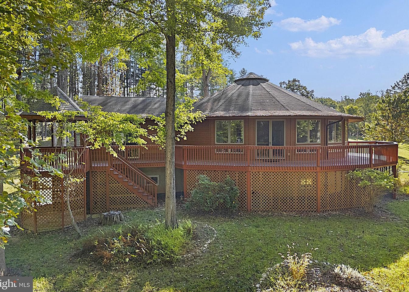 The image shows a unique octagonal house nestled among tall trees, showcasing its distinctive architecture. A spacious wooden deck wraps around the structure, offering ample outdoor space for relaxation. The warm, reddish-brown hues of the house complement the lush greenery, blending harmoniously with the natural surroundings. The sloping roof adds character, while multiple large windows provide abundant light and views of the forest. A staircase leads down to the ground level, surrounded by manicured grass and shrubs, enhancing the inviting atmosphere. The property exudes tranquility and a sense of connection with nature.