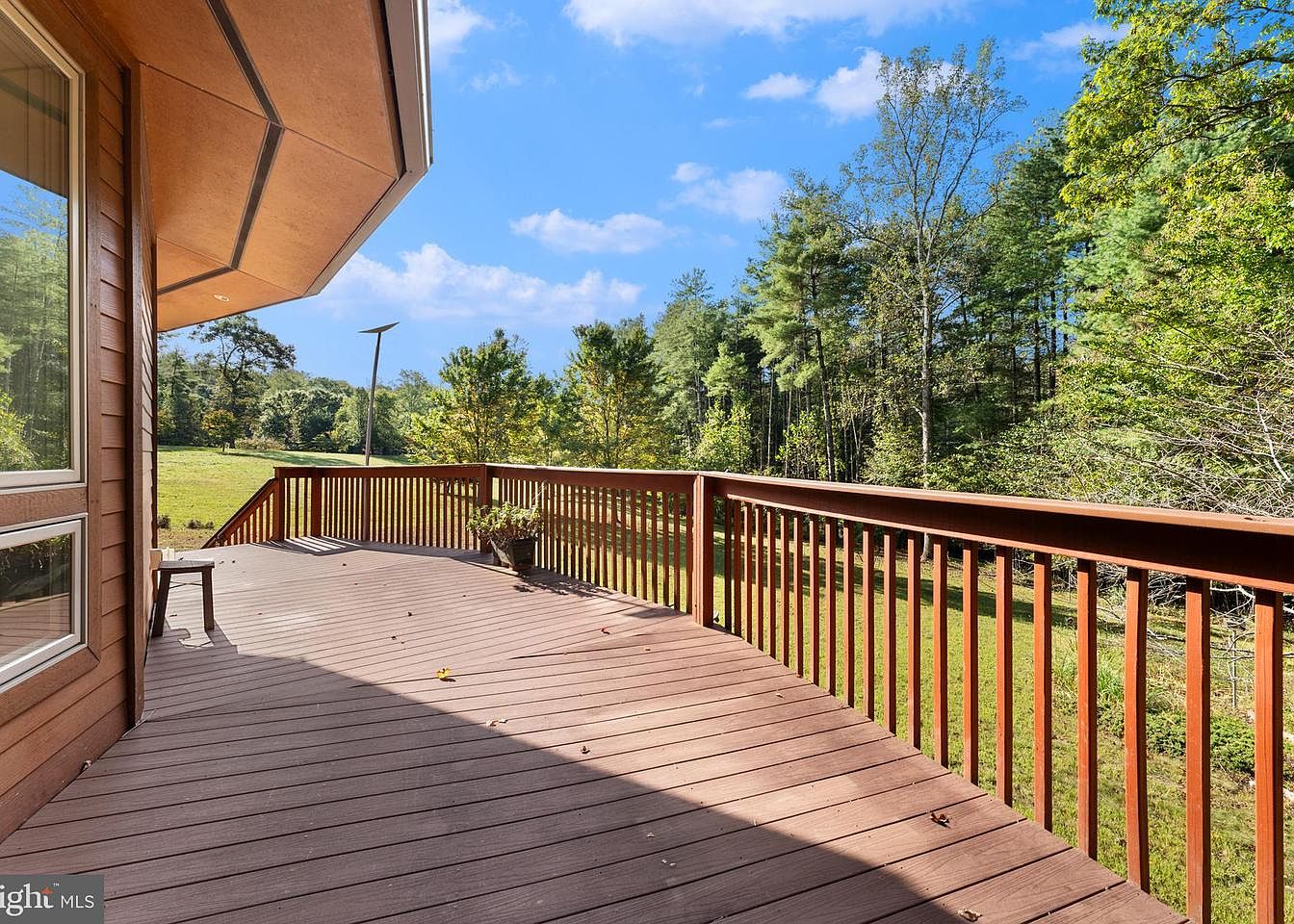 A spacious wooden deck extends from the house, featuring a rich, warm brown color that harmonizes with the natural surroundings. The deck is made of planks, allowing for a smooth walking surface. One corner holds a small potted plant, adding a touch of greenery. A lone wooden chair provides a cozy spot for relaxation, enhancing the inviting atmosphere. The railings, with their horizontal slats, create an open view of the lush landscape. Tall trees and open fields surround the area, bathed in soft sunlight under a clear blue sky, offering a serene outdoor retreat perfect for gatherings or quiet moments.