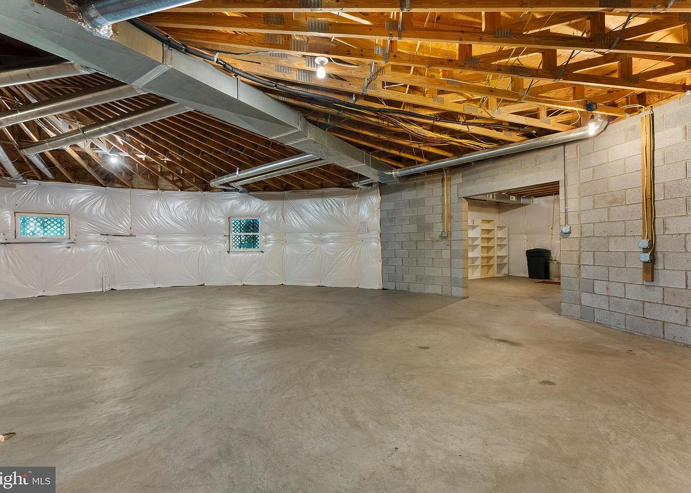 This basement space features exposed wooden beams and structural supports that create an industrial charm. The concrete floor is bare, reflecting an unfinished, utilitarian appeal. Surrounding the room, white plastic sheeting covers the walls, enhancing insulation while providing a clean, modern look. Natural light streams through small, inset windows adorned with lattice, adding a hint of warmth. To the right, a doorway leads to a smaller storage area lined with simple shelves, ideal for organization. Electrical conduits and fixtures are visible, emphasizing the basement’s operational purpose, making it a versatile area for various uses.