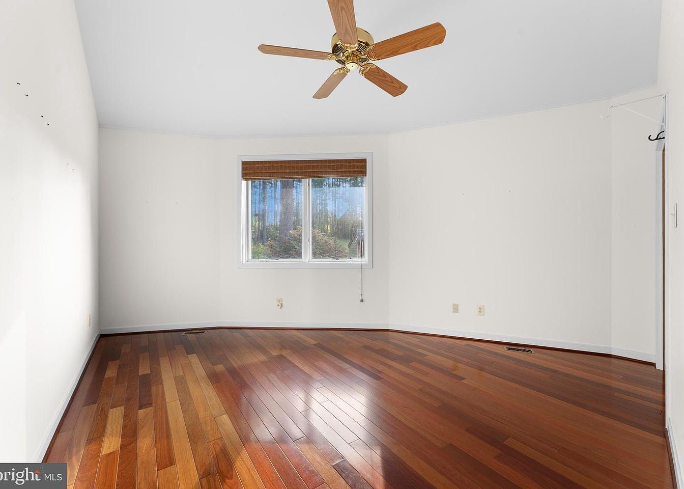 This bedroom features a spacious, bright layout accentuated by smooth, polished hardwood flooring in rich tones of amber and brown. A large window with a sleek wooden blind invites natural light and overlooks a tranquil outdoor scene, providing a connection to nature. Soft white walls enhance the airy feel, while a ceiling fan with wooden blades adds a touch of classic charm and functionality. The curved corner of the room creates a cozy atmosphere, ideal for relaxation. Minimalistic details ensure that the space maintains a serene ambiance, perfect for personalization with decor or furniture.