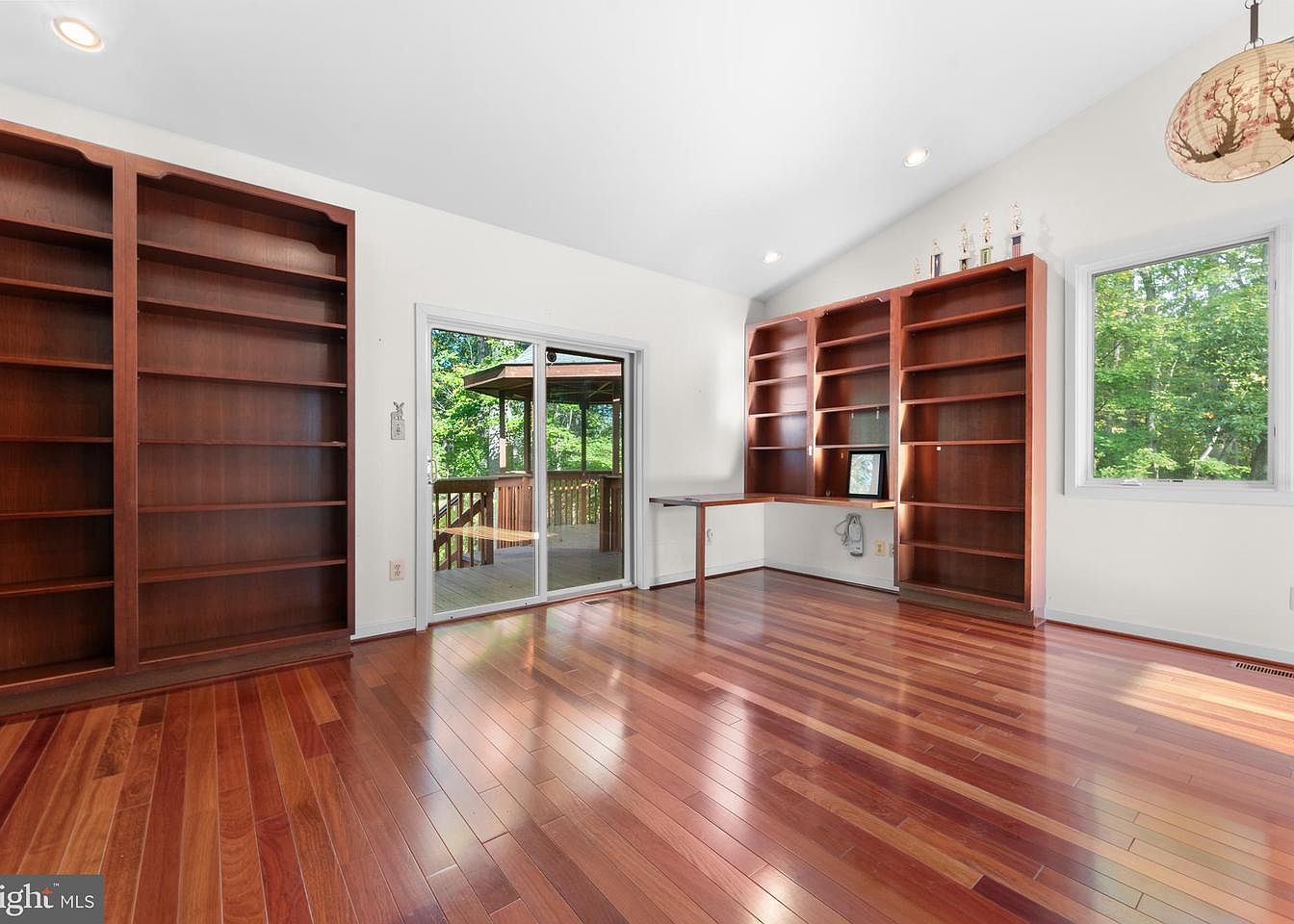 A serene study area featuring polished hardwood flooring that exudes warmth. The room boasts a cozy, light color palette on the walls, enhancing the bright atmosphere. On one wall, tall wooden bookshelves offer ample storage space, showcasing a rich mahogany finish. A built-in desk with a subtle overhang provides an ideal workspace, complementing the bookshelf design. Natural light floods in through large windows, revealing a view of a balcony and trees outside, merging indoor comfort with outdoor tranquility. A simple pendant light adds a touch of elegance, making the space inviting for reading or working.
