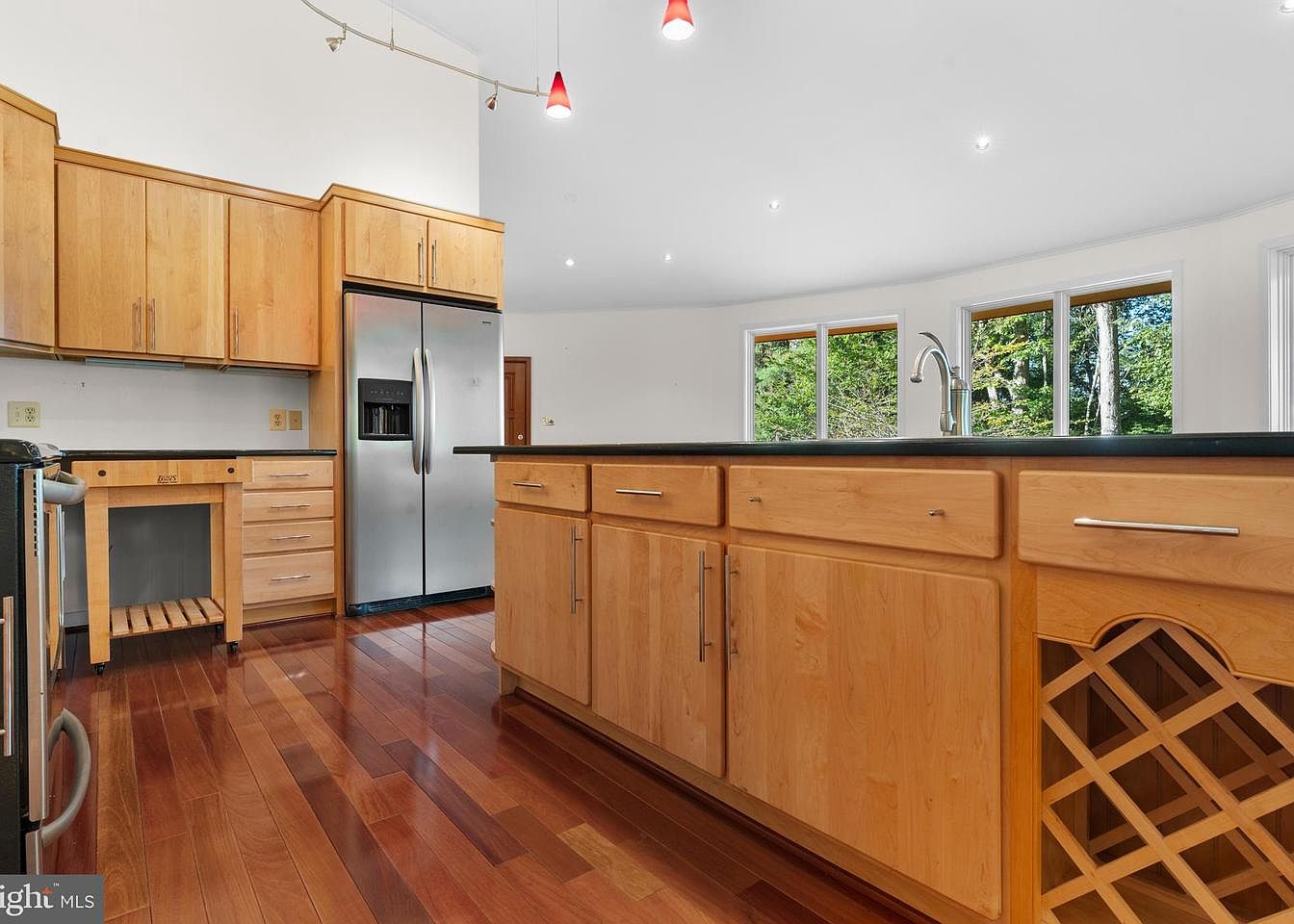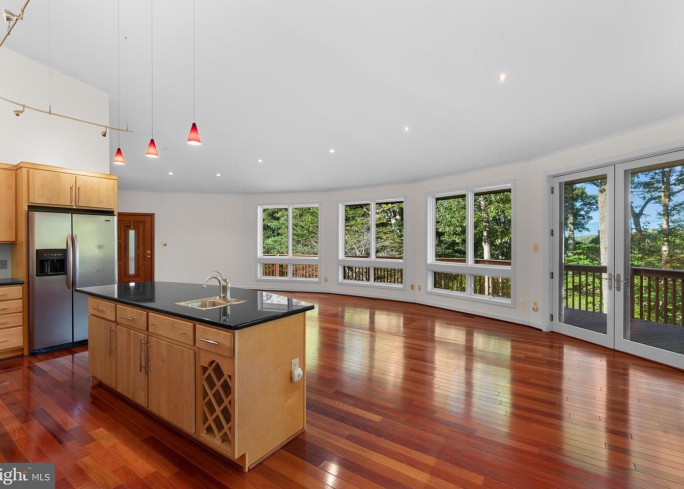 This kitchen features a central island with a sleek black countertop, complemented by light wood cabinetry. Stainless steel appliances add a modern touch, with a double-door fridge prominently displayed. The floor is crafted from rich, polished hardwood, enhancing warmth and elegance. Bright recessed lighting along the ceiling illuminates the space, and pendant lights with red shades provide additional focus over the island. Expansive windows surround the area, allowing natural light to flood in and provide picturesque views of the outdoor greenery. The overall aesthetic combines contemporary design with cozy elements, creating an inviting, functional space.
