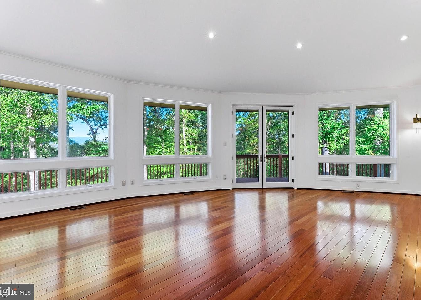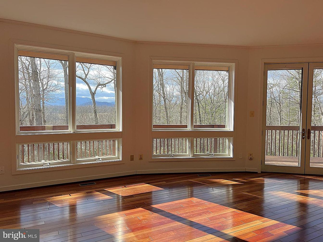 This living room features expansive, curved windows offering breathtaking views of the surrounding landscape, framed by bare trees and distant mountains. The warm, polished hardwood floors reflect the abundant natural light, enhancing the welcoming ambiance. The room’s neutral walls create a soothing backdrop, while the open layout emphasizes spaciousness. A sliding glass door leads to a deck, seamlessly connecting indoor and outdoor spaces. Architectural details include subtle moldings and strategically placed outlets, ensuring functionality without detracting from the aesthetic. Overall, the room presents a serene retreat, ideal for relaxation while enjoying nature’s beauty.