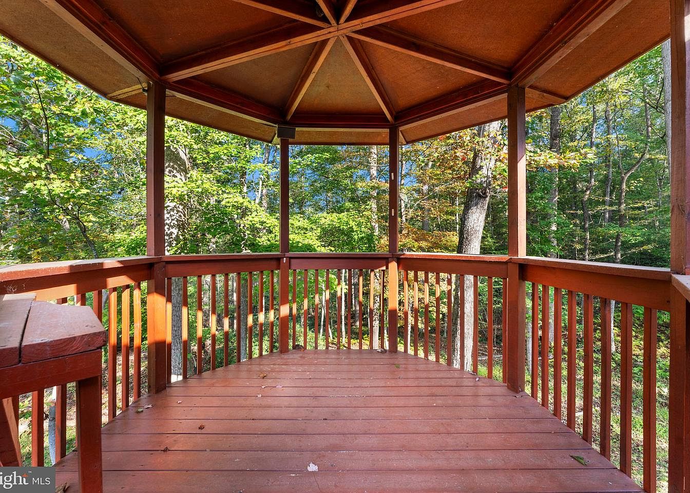 This octagonal gazebo is constructed with a rich wooden frame, emphasizing a warm, natural aesthetic. The floor features polished wooden planks that enhance the inviting atmosphere. Surrounding the gazebo, large windows reveal a vibrant display of lush greenery, showcasing the beauty of the landscape. Beams extend from the center of the ceiling, adding a touch of architectural interest. Sunlight filters through the trees, casting playful shadows on the floor, creating a serene and peaceful ambiance. This space offers a perfect vantage point for relaxation, reading, or enjoying nature while being sheltered from the elements.