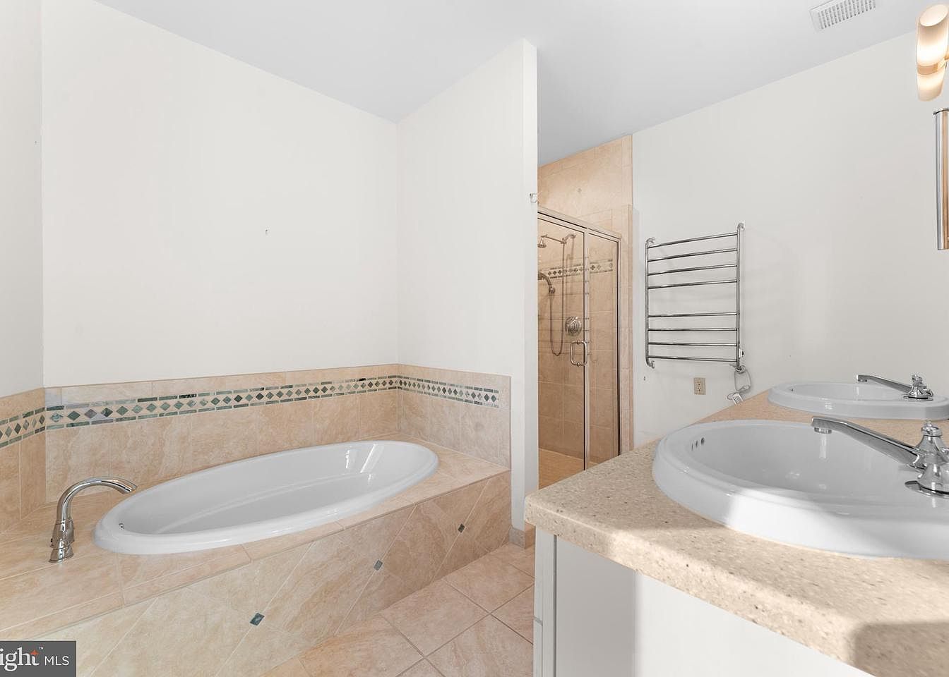 This bathroom features a spacious layout with a luxurious bathtub set against a cream-colored wall. The bathtub is elegantly designed and surrounded by beige tiles with decorative mosaic accents. A streamlined double vanity with round sinks offers modern functionality, paired with chrome faucets for a sleek look. To the right, a glass shower enclosure showcases tiled walls and contemporary fixtures. A towel rack is neatly mounted on the wall, enhancing accessibility. Natural light can filter through, balancing the soft tones of the tiles and creating a calm, inviting atmosphere perfect for relaxation.