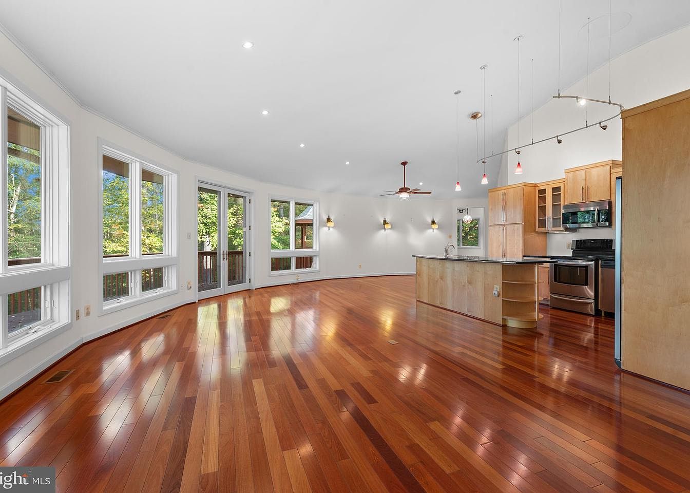 This spacious living room features an open layout with high ceilings and an abundance of natural light flowing through large windows. The elegant hardwood flooring boasts rich hues, contrasting beautifully with the neutral white walls. A modern kitchen area blends seamlessly into the space, showcasing sleek cabinetry and stainless steel appliances. Pendant lights hang delicately above the central island, while a ceiling fan adds a touch of comfort. The panoramic views of the surrounding greenery enhance the tranquil ambiance, creating a perfect environment for relaxation or entertaining. Overall, it exemplifies contemporary living with earthy tones.