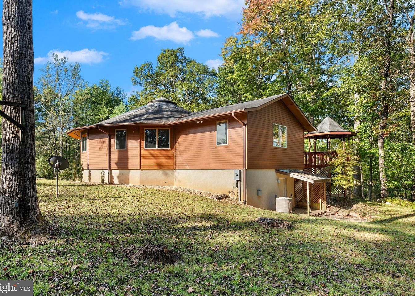 The image reveals the exterior of a unique, historic home nestled in a wooded area. The structure features a combination of earthy brown siding and a round roof topped with shingles, harmonizing with the natural surroundings. Large windows allow for ample light, enhancing the inviting facade. The building is partially elevated on a concrete base and has symmetrical, clean lines, adding to its architectural elegance. Nearby, a quaint gazebo complements the house, offering a shaded spot amid the lush greenery. The well-maintained lawn, dotted with fallen leaves, contributes to the serene, rustic atmosphere.