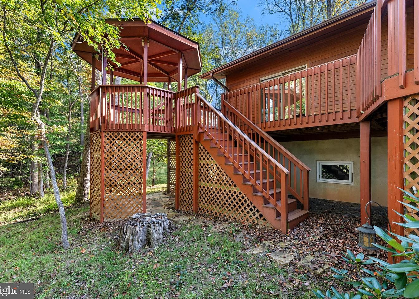 The image features a multi-level deck structure elevated above the ground, with a wooden staircase leading from the lower area to an upper gazebo-like platform. The deck exhibits warm wood tones complemented by a lattice design beneath. Surrounding the deck, lush greenery hints at a natural, tranquil setting. The flooring has a smooth finish, emphasizing craftsmanship. The upper level, offering a panoramic view, is supported by sturdy posts and a peaked roof, fostering an inviting atmosphere. In the foreground, a rustic stump adds to the earthy feel, nestled among fallen leaves, enhancing the charming backyard ambiance.