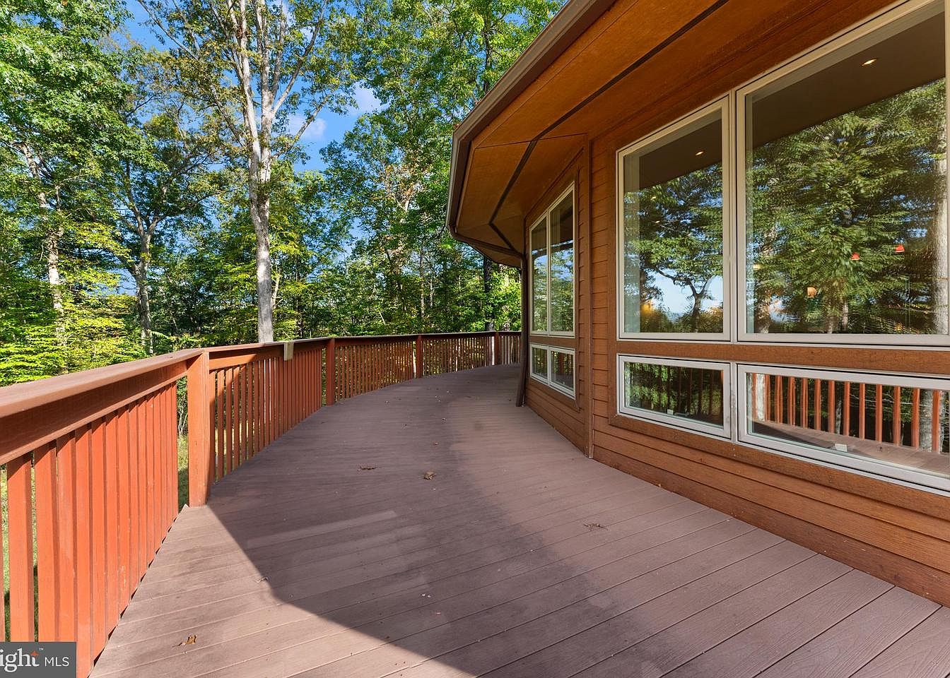 This expansive deck features a smooth wooden surface that extends around the house, providing a seamless transition between indoor and outdoor spaces. The warm brown tones of the decking harmonize with the natural surroundings, enhanced by lush green trees in the background. Large, panoramic windows reflect the vibrant foliage, inviting ample natural light into the adjacent rooms. The rounded corners of the deck add a modern touch to the design, while the sturdy railings ensure safety without obstructing views. This outdoor area is perfect for relaxation, entertaining, or enjoying the serene landscape.