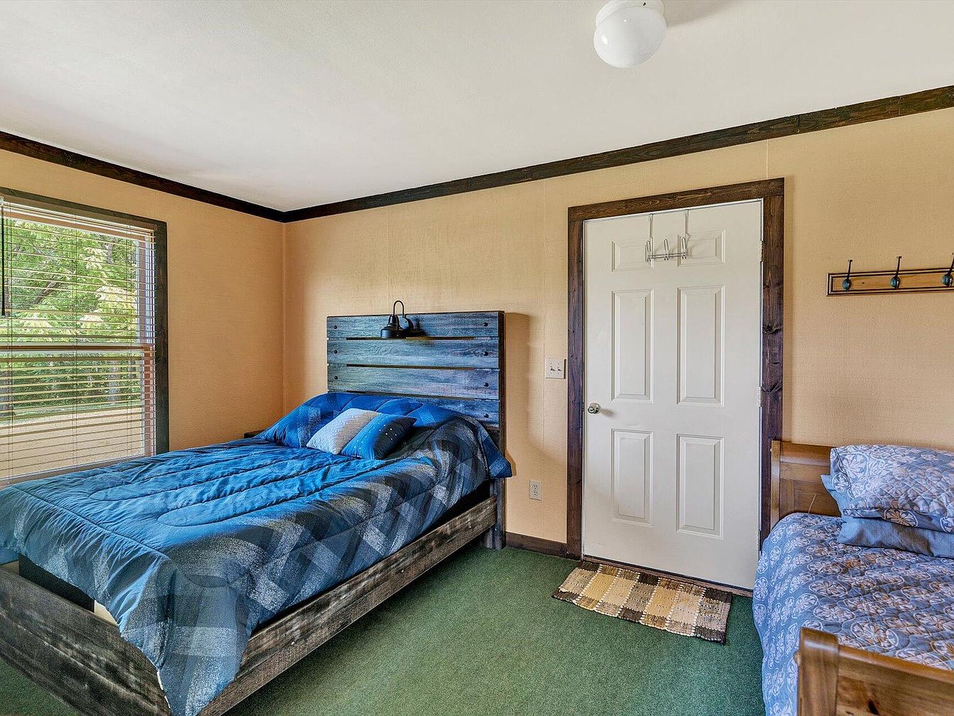 A cozy bedroom featuring a rich color palette dominated by blues and earthy tones. The focal point is a large bed with a rustic wooden headboard, adorned with a textured blue comforter and accent pillows, creating an inviting atmosphere. To the right, a second bed with a subtle patterned quilt complements the space. The floor is covered in a soft green carpet, enhancing comfort. Natural light flows through a sizable window with wooden blinds, offering a connection to the outdoors. Architectural details include painted wood trim, a white door with modern hardware, and wall hooks for added functionality.