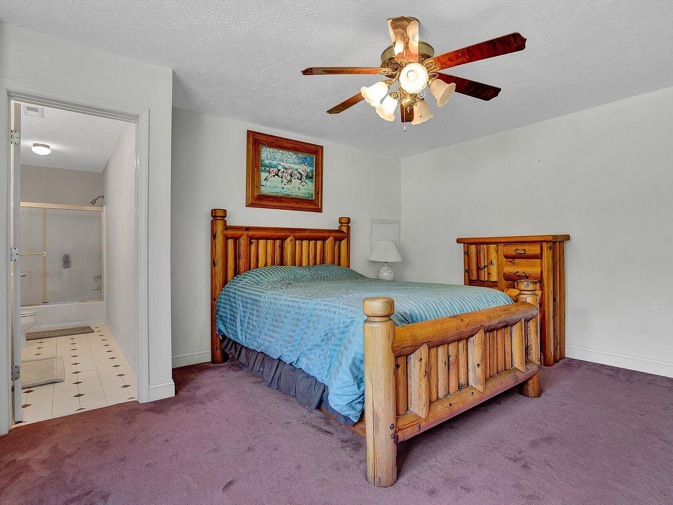 A cozy bedroom featuring a rustic theme predominantly showcased through the log cabin-style furniture. The centerpiece is a sturdy wooden bed framed with intricately turned posts, adorned with a soft, blue striped comforter. A matching nightstand complements the bed, adding functional charm. The room is carpeted in a warm, muted purple tone that enhances the rustic warmth. A ceiling fan with several light fixtures provides both light and air circulation. An artistic landscape painting hangs above the bed, introducing an inviting touch. An adjoining bathroom is visible through a door, offering modern amenities.