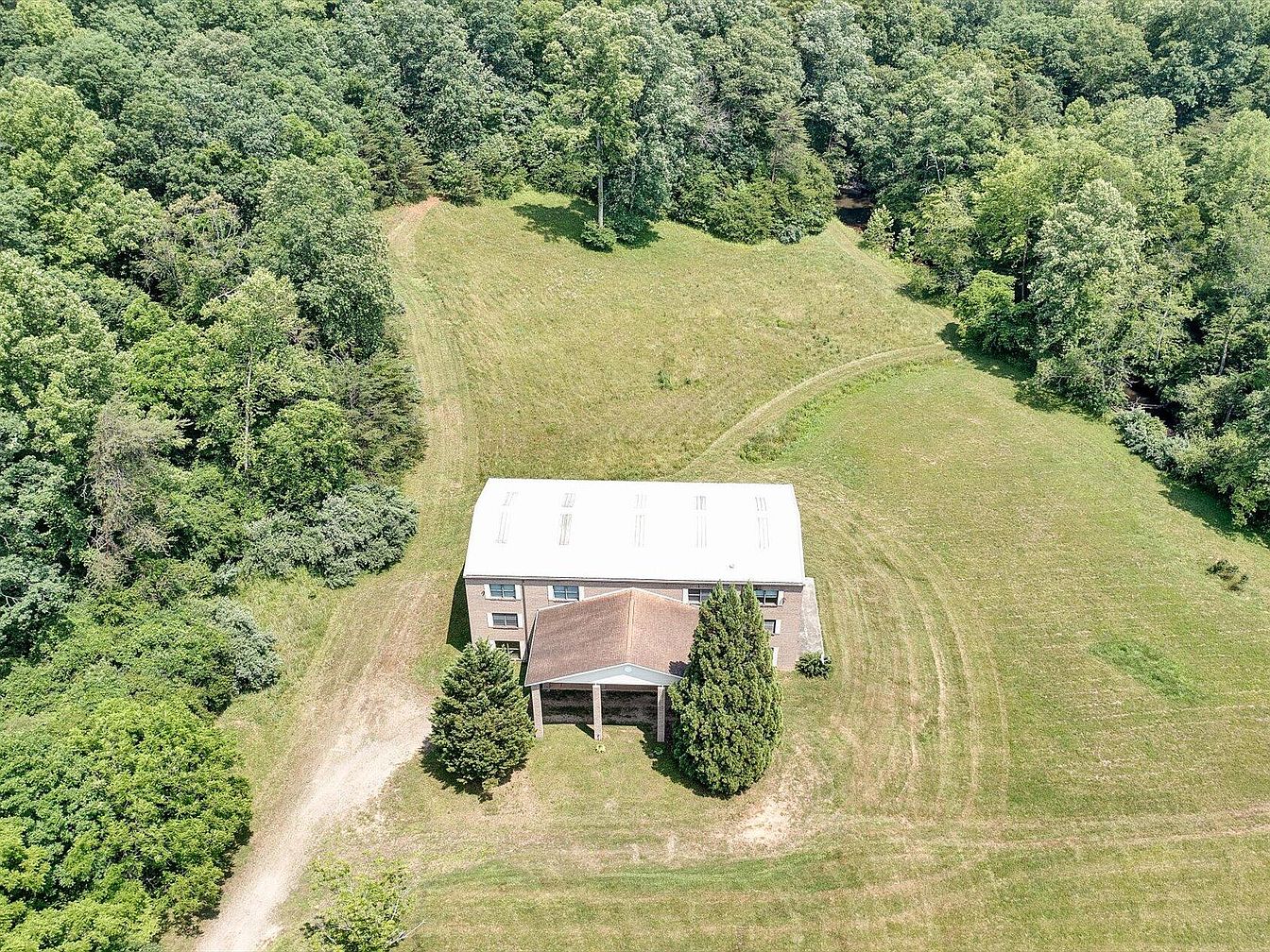 This aerial view showcases a spacious historic American home surrounded by lush greenery. The house, constructed with a mix of brick and a metal roof, features a simple yet elegant facade. A porch with classic columns provides a welcoming entrance, while the sloped roof adds architectural interest. The surrounding landscape includes expansive grassy areas interspersed with clusters of trees, enhancing the natural beauty. A winding dirt path leads to the home, suggesting a sense of privacy and seclusion. The overall aesthetic combines rustic charm with the tranquility of a serene countryside setting.