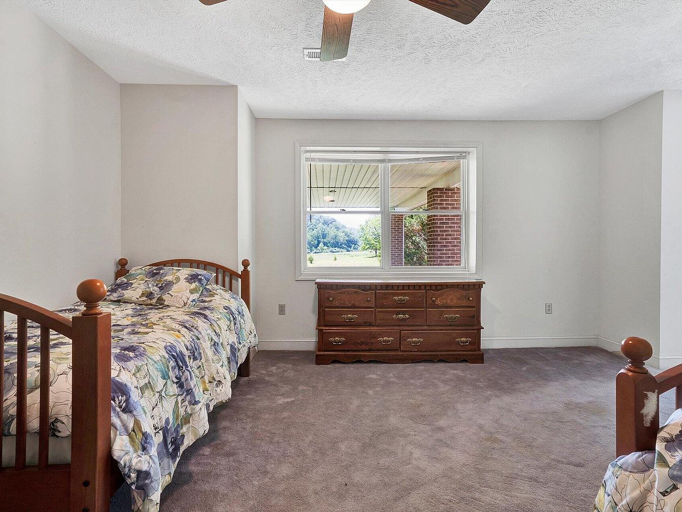 This bedroom features two wooden beds with decorative floral bedding and matching pillows, contributing to a cozy, inviting atmosphere. The walls are painted in a soft, neutral color, complementing the warm tones of the wood furniture. A large window allows natural light to flood the space, offering views of the outdoors, and is framed with simple white trim. A wooden dresser with intricate detailing sits against one wall, adding functionality and charm. The plush carpet underfoot enhances comfort, while a ceiling fan above promotes airflow, making this room a serene retreat.