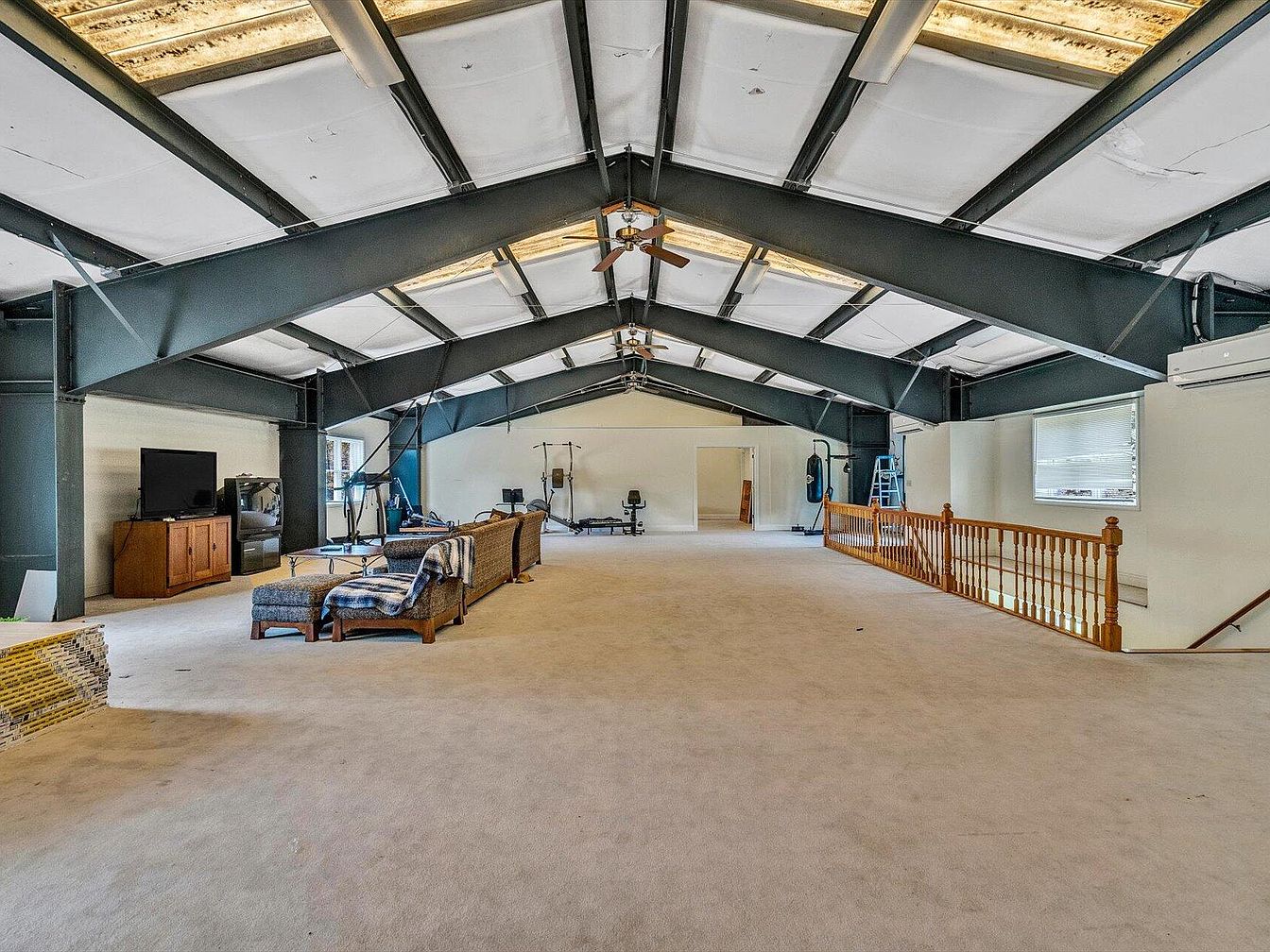 This expansive open area features a high ceiling with exposed steel beams, providing an industrial yet spacious ambience. The floor is carpeted in a neutral beige, enhancing the soft and inviting atmosphere. A large, sectional wicker sofa adorned with a textured throw blanket creates a comfortable lounge spot, complemented by a wooden entertainment unit housing a television. To one side, exercise equipment indicates a potential for active use. Natural light filters through several windows, illuminating the room’s subtleties. A wooden railing outlines a staircase, adding architectural interest while defining the space.