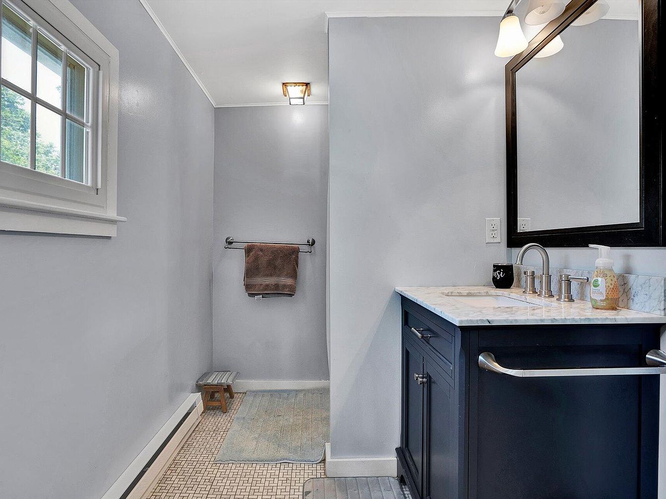 This bathroom features a sleek design with a modern touch. The walls are painted in a soft gray, creating a serene atmosphere. A stylish black vanity with a white marble countertop provides contrast and elegance. Above the sink, a rectangular mirror framed in black enhances the aesthetic. Natural light floods in through a small window, complementing the space. A neatly arranged towel on the chrome rod adds a pop of warmth. The floor showcases a vintage-inspired tile pattern that enhances the character of the room, while a small wooden stool and a plush bath mat add functionality and comfort.