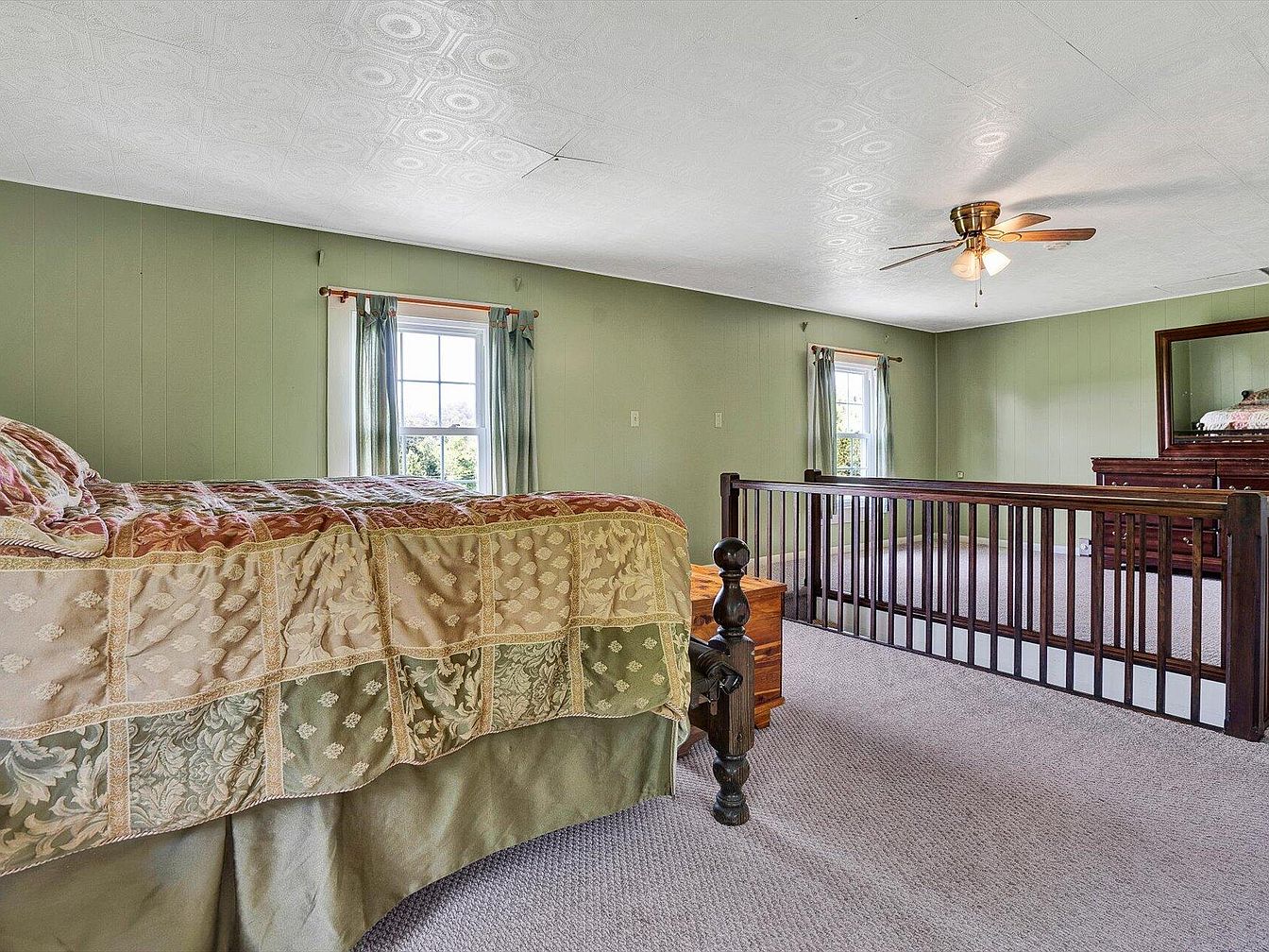 A spacious bedroom features soft green walls and a textured ceiling, creating a calm atmosphere. A large, ornate bed draped with rich, patterned bedding commands attention, its quilt showcasing floral designs in muted tones. Adjacent, a wooden dresser complements the décor, reflecting the home’s historic charm. Two windows with sheer curtains frame a view of the outdoors, enhancing natural light. A cozy carpet covers the floor, adding warmth. The room is separated by a wooden railing, offering a subtle boundary to another space. A ceiling fan provides comfort, completing this inviting, tranquil retreat.