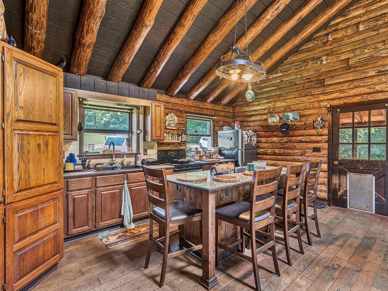 This rustic kitchen features exposed wooden beams that draw the eye upwards, enhancing the cabin aesthetic. The dark wood ceiling contrasts beautifully with the lighter tones of the log walls. A central island, adorned with granite, provides space for meal prep and seating on rustic wooden stools. Counters are filled with kitchenware, and the cabinetry marries functionality with warmth through its rich, textured wood finish. Natural light floods in through a window above the sink, framed by simple curtains. A rustic door leads outside, creating an inviting connection to nature while maintaining a cozy, homey feel.