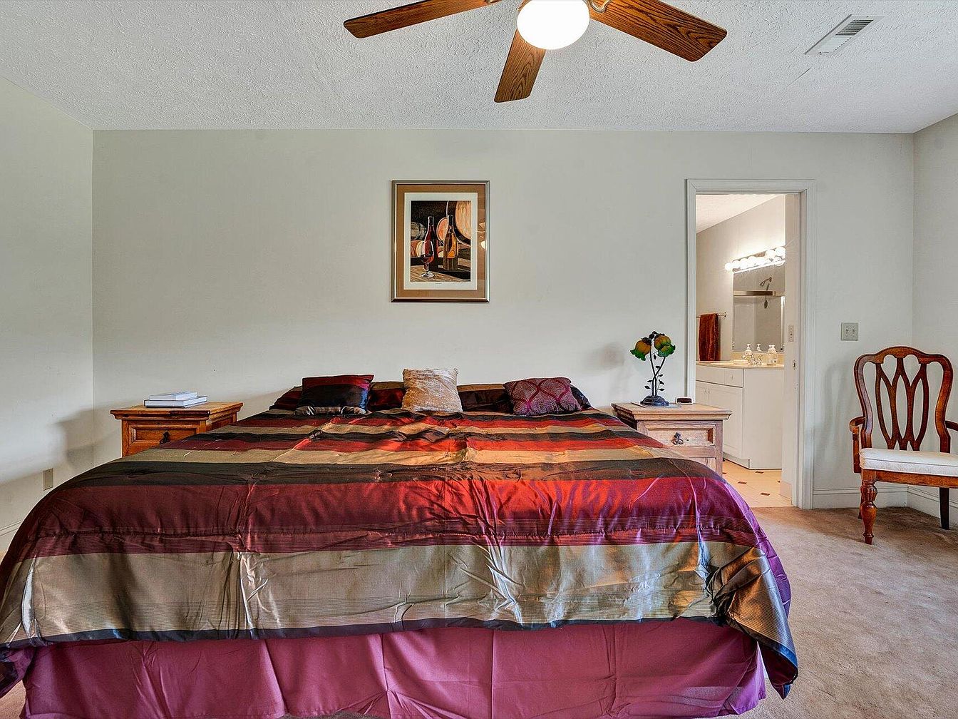 This bedroom features a spacious layout with neutral-colored walls and plush carpeting, creating a cozy atmosphere. A large bed adorned with a richly textured blanket in deep burgundy and earthy tones dominates the space, complemented by several decorative pillows. Beside the bed, a small wooden nightstand holds a classic lamp and a few books. A vintage-style chair with a light cushion enhances the elegance of the room. The artwork on the wall adds a touch of sophistication. A doorway leads to a well-lit bathroom area, complete with modern fixtures and additional storage, merging functionality with style.