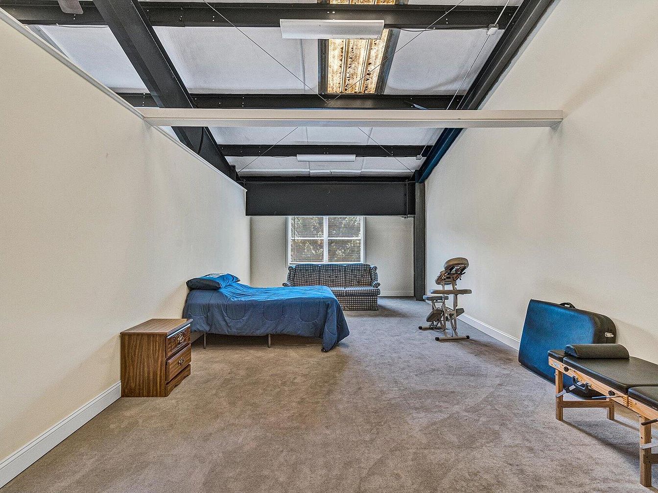This spacious bedroom features ample natural light from a large window, highlighting a minimalist aesthetic. The walls are painted in a soft neutral tone, complemented by plush beige carpet underfoot. A queen-sized bed with a blue comforter is positioned on one side, while a modest wooden nightstand adds functionality. Across the room, a blue and white checkered couch offers a cozy seating area. The exposed beams of the ceiling add an industrial touch, contrasting with the room’s calm color scheme. To the side, fitness equipment hints at a multi-functional space, merging relaxation with wellness.