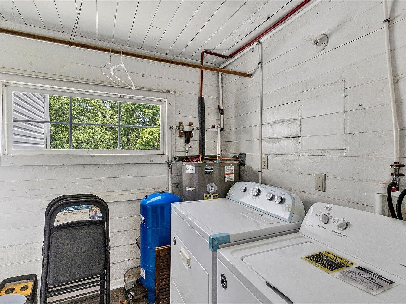 This laundry room features a functional layout highlighted by whitewashed wooden walls that impart a bright, airy feeling. A large window invites natural light, showcasing views of greenery outside. The space is equipped with a modern washer and dryer, both in sleek white, simplifying laundry tasks. A blue water pressure tank and utility connections complement the room’s practicality. A folding chair enhances usability, while additional storage is evident with various hoses and a heater in the corner. The ceiling’s exposed beams and hanging rods add character, merging modern convenience with a touch of rustic charm.