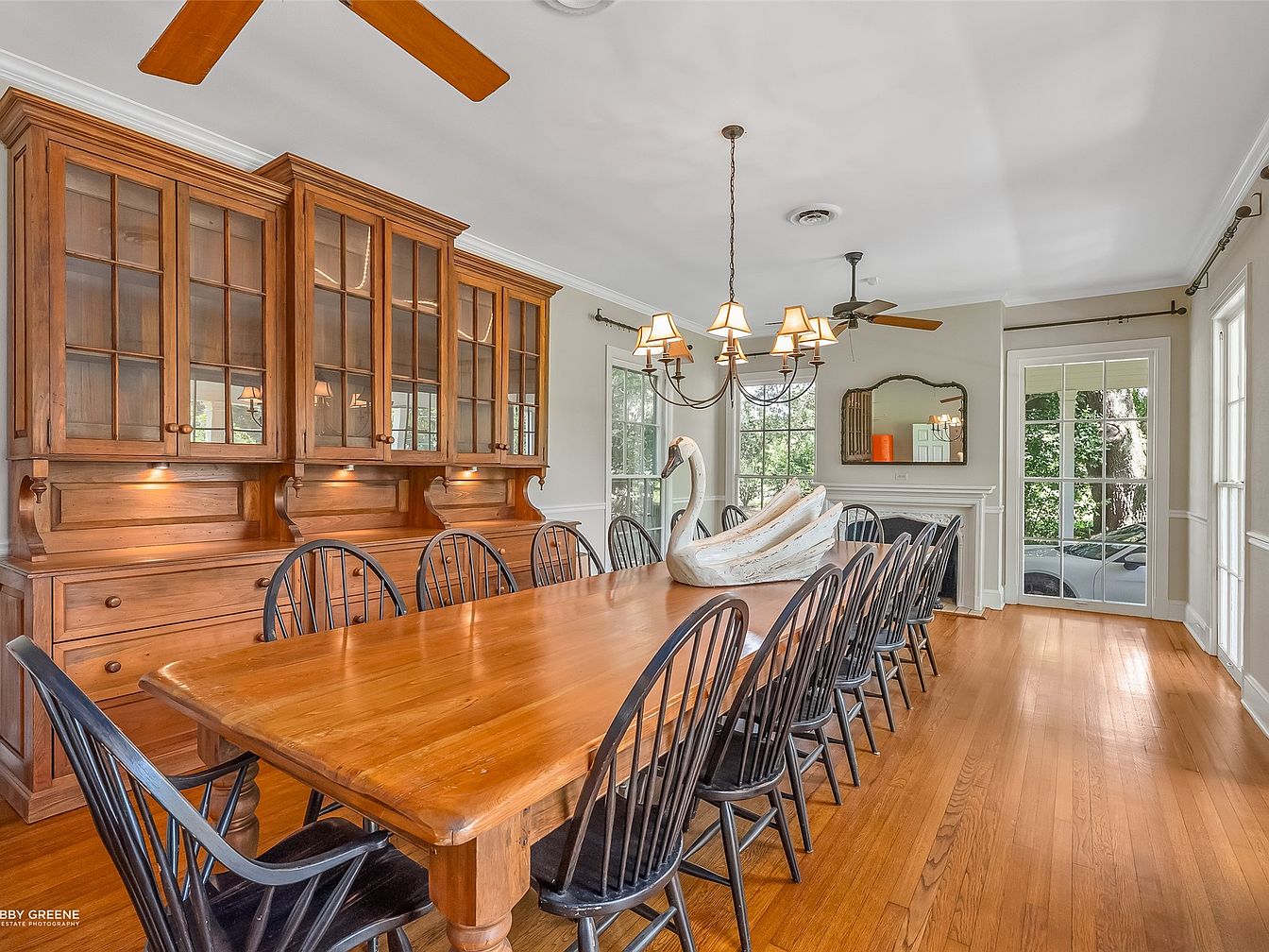A spacious dining room features a long, polished wooden table surrounded by Black the classic spindle-back chairs, perfect for large gatherings. Flanking the table are two lighted wooden hutches showcasing elegant glassware and artifacts, enhancing the warm ambiance. A stylish chandelier with multiple lamps hangs above, complemented by the natural light streaming in through large windows adorned with simple window treatments. The walls are painted a soft neutral tone, contrasting with the rich wood tones of the furniture. Architectural details include crown molding and a subtle wainscoting, creating an inviting atmosphere ideal for family dinners.