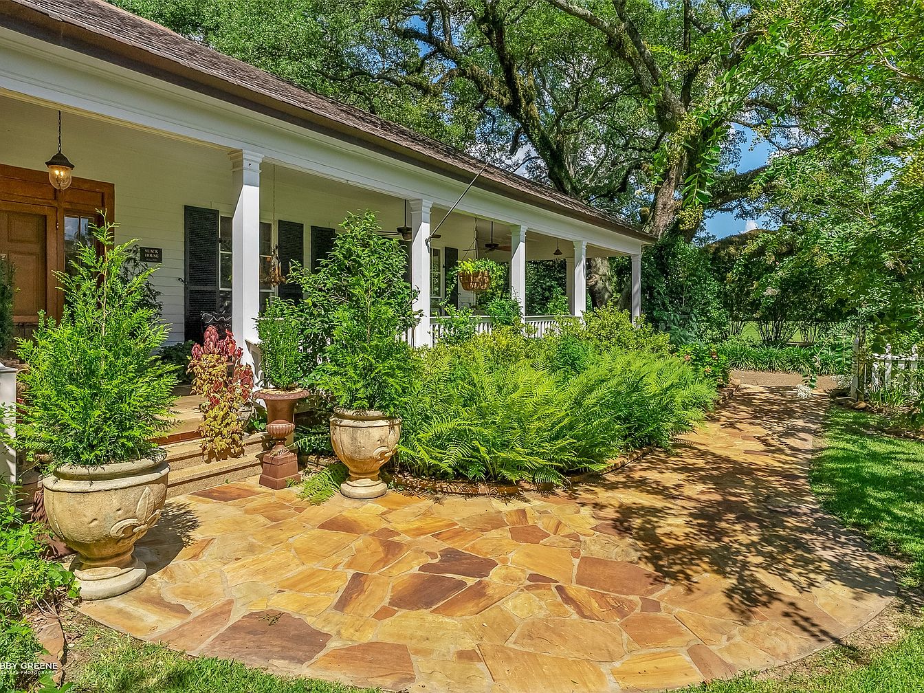 The image showcases a charming front porch area of a historic American home. The entrance features a sturdy wooden door, flanked by vibrant greenery, including small trees and flower beds. Decorative stone planters add elegance, while the natural stone pathway curves gracefully, enhancing the organic feel. Architectural details include crisp white pillars and a sloped roof, inviting a warm ambience. The color scheme is soothing, with earthy tones from the stone contrasted against the lush greens of the surrounding plants. Overall, this space radiates warmth and a welcoming atmosphere, perfect for relaxation and greeting guests.