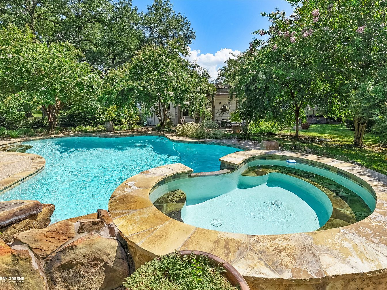 This outdoor space features a shimmering pool with a gently curving design, complemented by a connected spa, both surrounded by natural stone finishes. The vibrant turquoise water reflects the blue sky, inviting relaxation. Lush greenery encircles the area, including flowering trees and well-maintained shrubs that add privacy and charm. The pool deck showcases a mix of textured stones, creating a rustic elegance. Natural light filters through the foliage, enhancing the serene atmosphere. This tranquil oasis is perfect for leisurely days, providing a picturesque backdrop for outdoor gatherings and personal retreat moments.