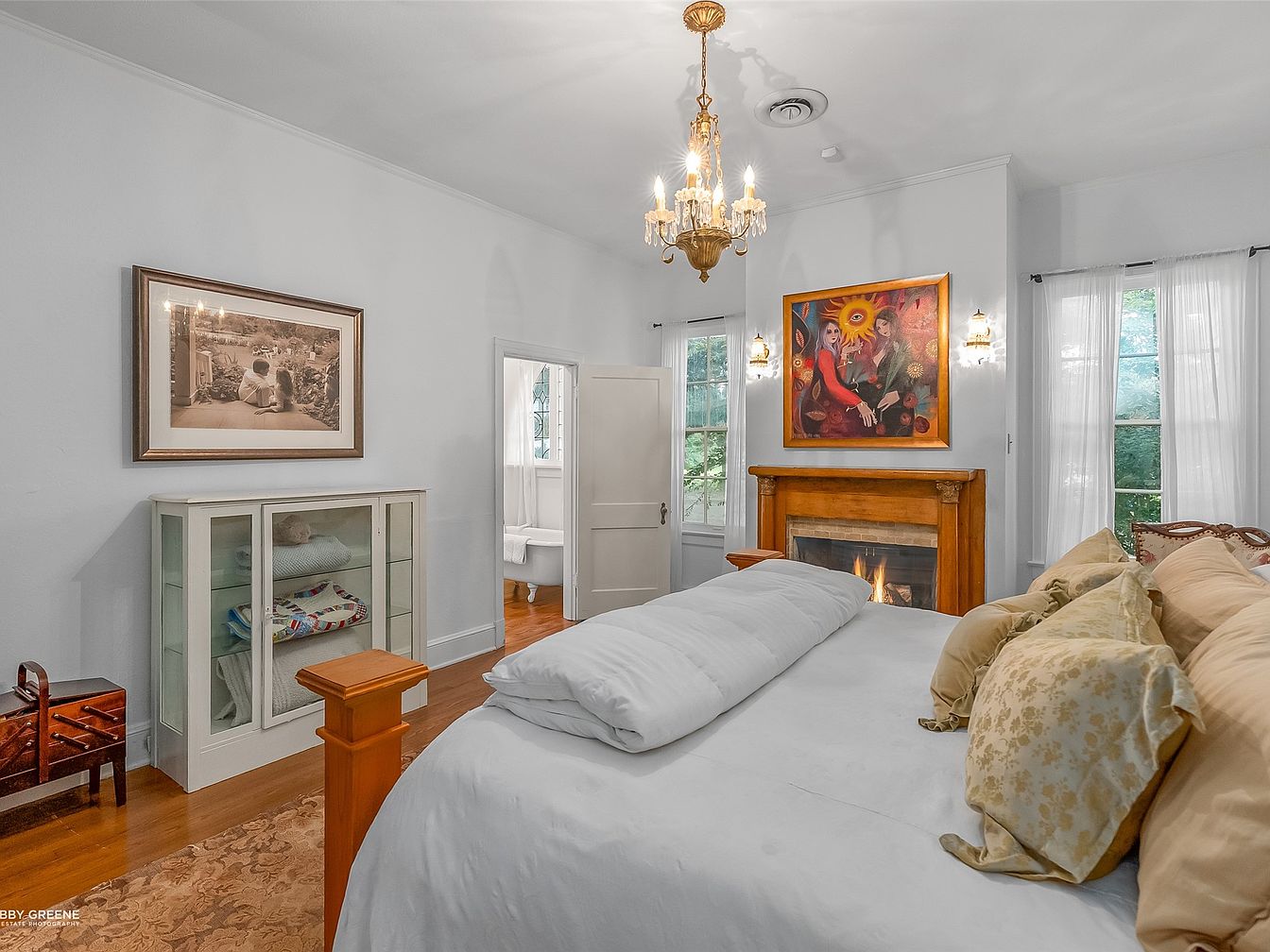 The bedroom features a spacious layout with light-colored walls that enhance the airy feel. A plush, white comforter adorns a large bed, flanked by an assortment of decorative pillows in soft gold and beige hues. A vintage-style wooden headboard adds warmth and character. To the side, a glass-fronted cabinet displays folded linens and colorful textiles, complementing the overall decor. An elaborate chandelier hangs from the ceiling, providing elegant illumination, while wall sconces cast a gentle glow. Large windows dressed with sheer curtains invite natural light, and a stylish painting over the fireplace serves as a focal point.
