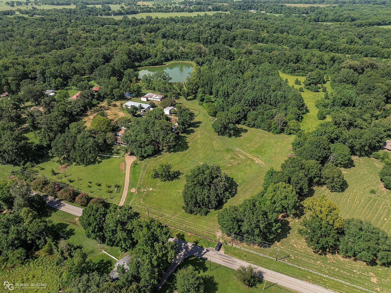 This image captures an expansive view of a historic American home surrounded by lush greenery and a serene pond. The property features well-maintained lawns and tree-lined borders, creating a picturesque landscape. A winding dirt path leads through the landscape, connecting the home to the road while inviting exploration. The patchwork of vibrant green grass contrasts beautifully with the water, enhancing the tranquil aesthetic. Various outbuildings are visible, adding to the rural charm. The overall composition conveys a sense of space, natural beauty, and a peaceful retreat amidst a verdant environment.
