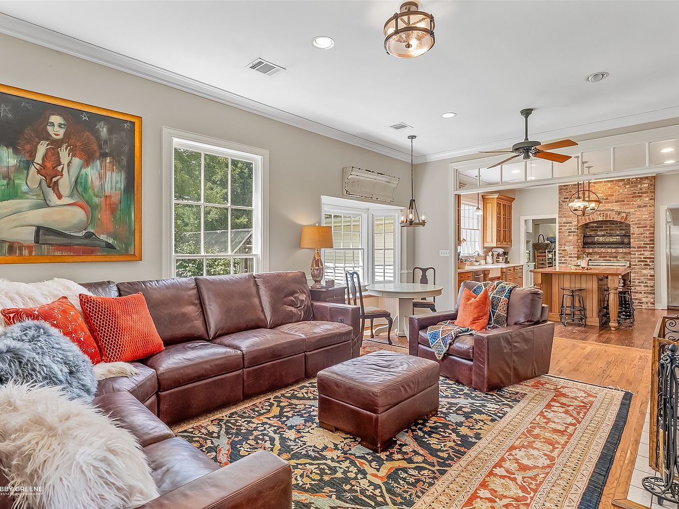 The living room features a cozy layout with a large, rich brown leather sectional sofa adorned with colorful decorative pillows in shades of red and blue. A plush area rug with intricate patterns grounds the space, enhancing warmth and texture. To the left, large windows allow natural light, complementing the neutral wall color. A striking artwork hangs prominently above the couch, showcasing bold colors and an intriguing figure. Adjacent, a round dining table with dark wooden chairs invites casual gatherings. Architectural elements like crown molding and exposed brick in the background add character and a rustic touch.