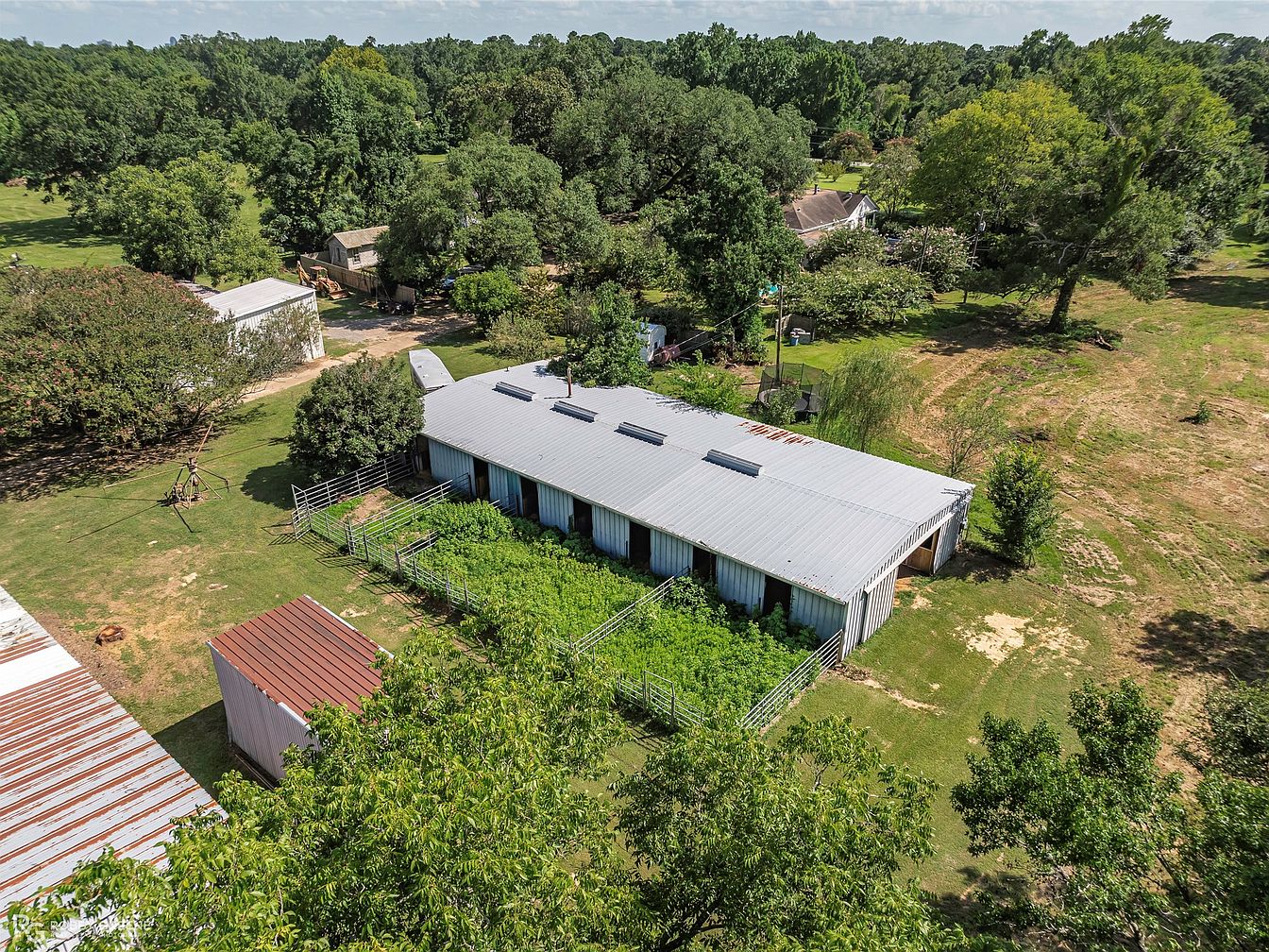 Aerial view of a farm structure, highlighting its long, metal-roofed shape nestled within a lush landscape. The building is surrounded by vibrant greenery, with overgrown plants and trees emphasizing a rustic ambiance. The structure features several skylights, providing natural light to the interior. Nearby, a red-roofed shed stands out against the verdant backdrop. The open land around the building suggests potential for agricultural use, while a visible dirt path leads further into the property, enhancing accessibility. Overall, the scene conveys a sense of tranquility and simplicity, characteristic of rural life.
