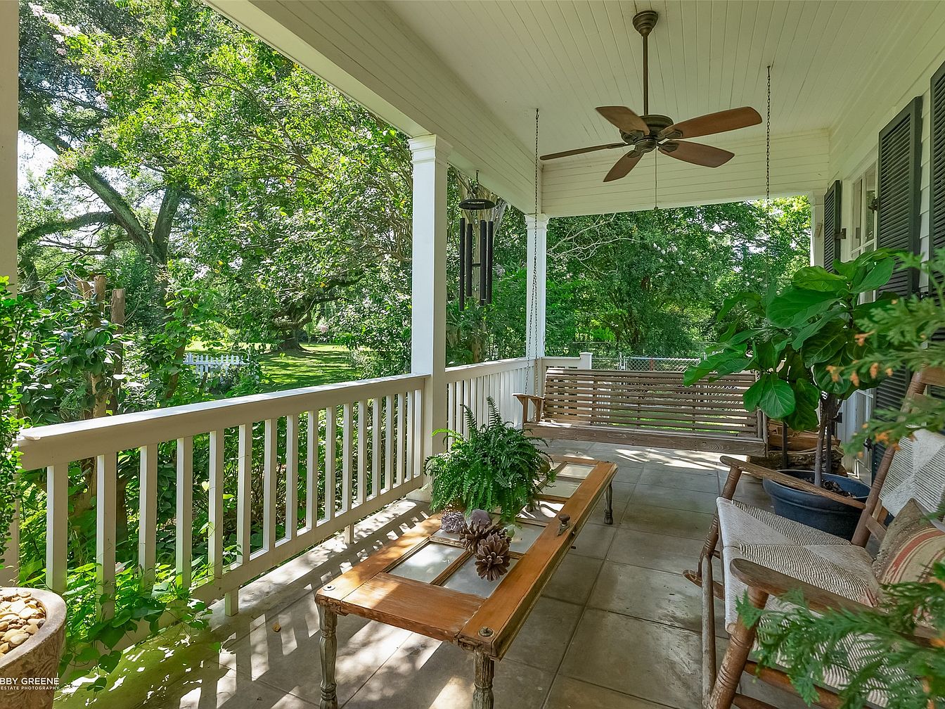 A spacious front porch exuding a welcoming aura features a comfortable swing and rustic chairs, perfect for leisurely afternoons. The flooring, composed of pale, square tiles, complements the light beige railings, enhancing the airy feel. Lush greenery frames the scene, with vibrant potted plants and a fern adding lively touches. A ceiling fan hangs elegantly, providing a cool breeze under the expansive white ceiling. The subtle contrast with dark wooden accents on the furniture and shutters brings warmth, creating a charming space that invites relaxation and connection with the surrounding nature.