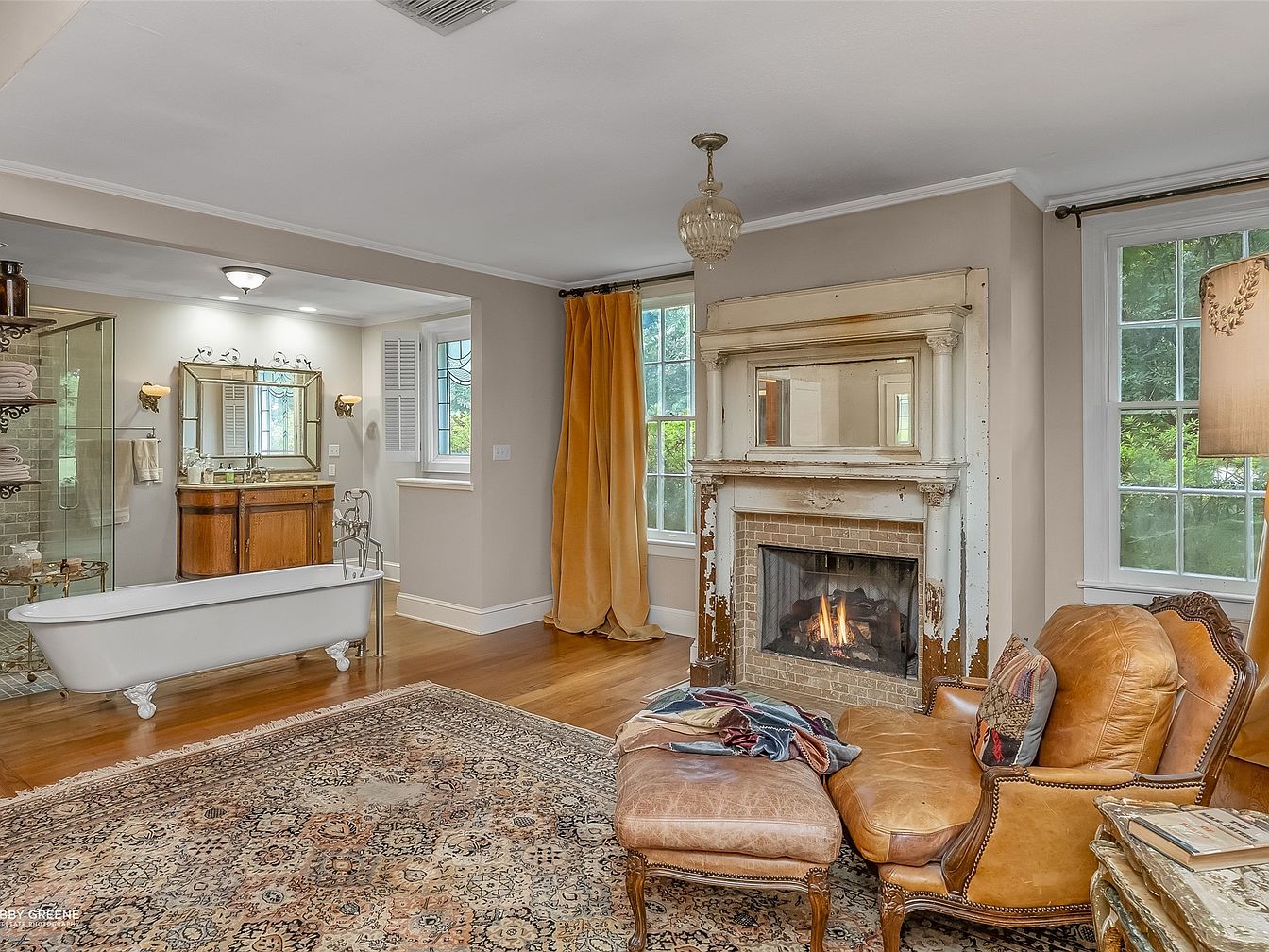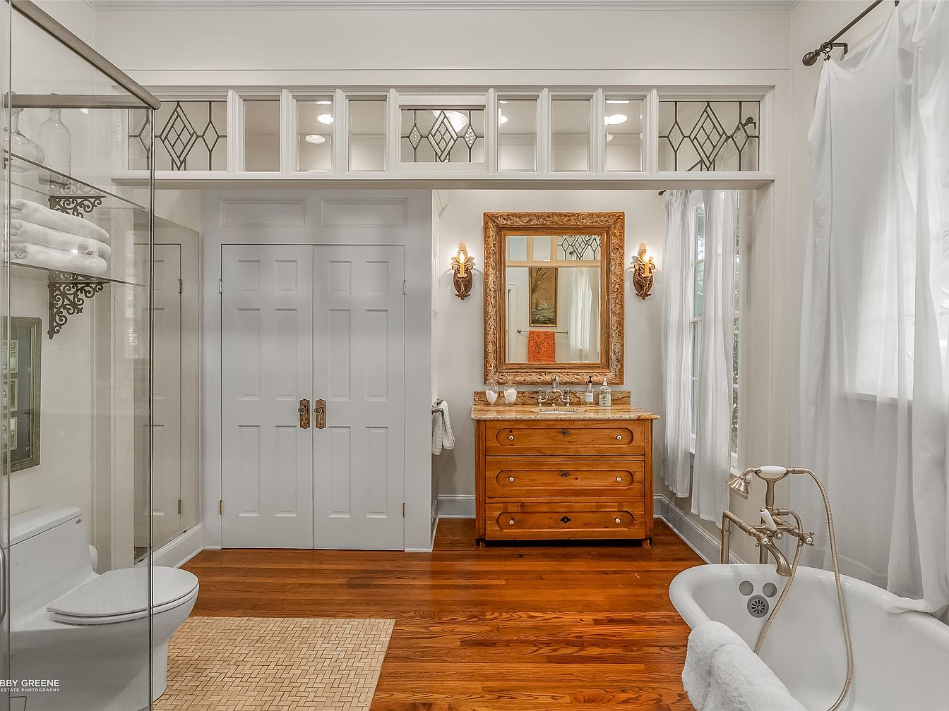 This charming bathroom features a spacious layout with a glass shower enclosure and a classic freestanding bathtub. The warm wood flooring contrasts elegantly with the crisp white walls, while natural light filters through sheer curtains, adding a soft glow to the space. An ornate wooden dresser, showcasing a decorative mirror, serves as a striking focal point. Luxurious towels are neatly arranged in a glass shelf above the toilet, and wall sconces provide additional ambient lighting. Architectural details, including molded trim and vintage-inspired fixtures, enhance the room’s refined aesthetic, blending contemporary comfort with historic charm.