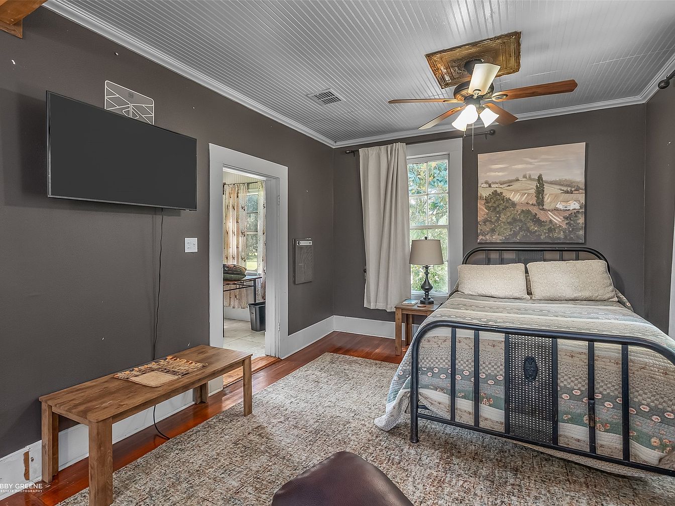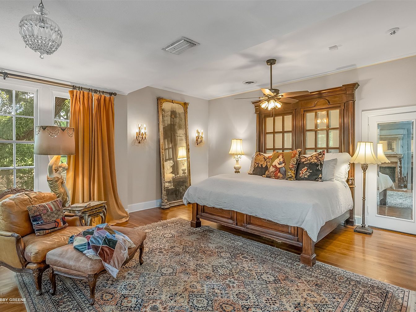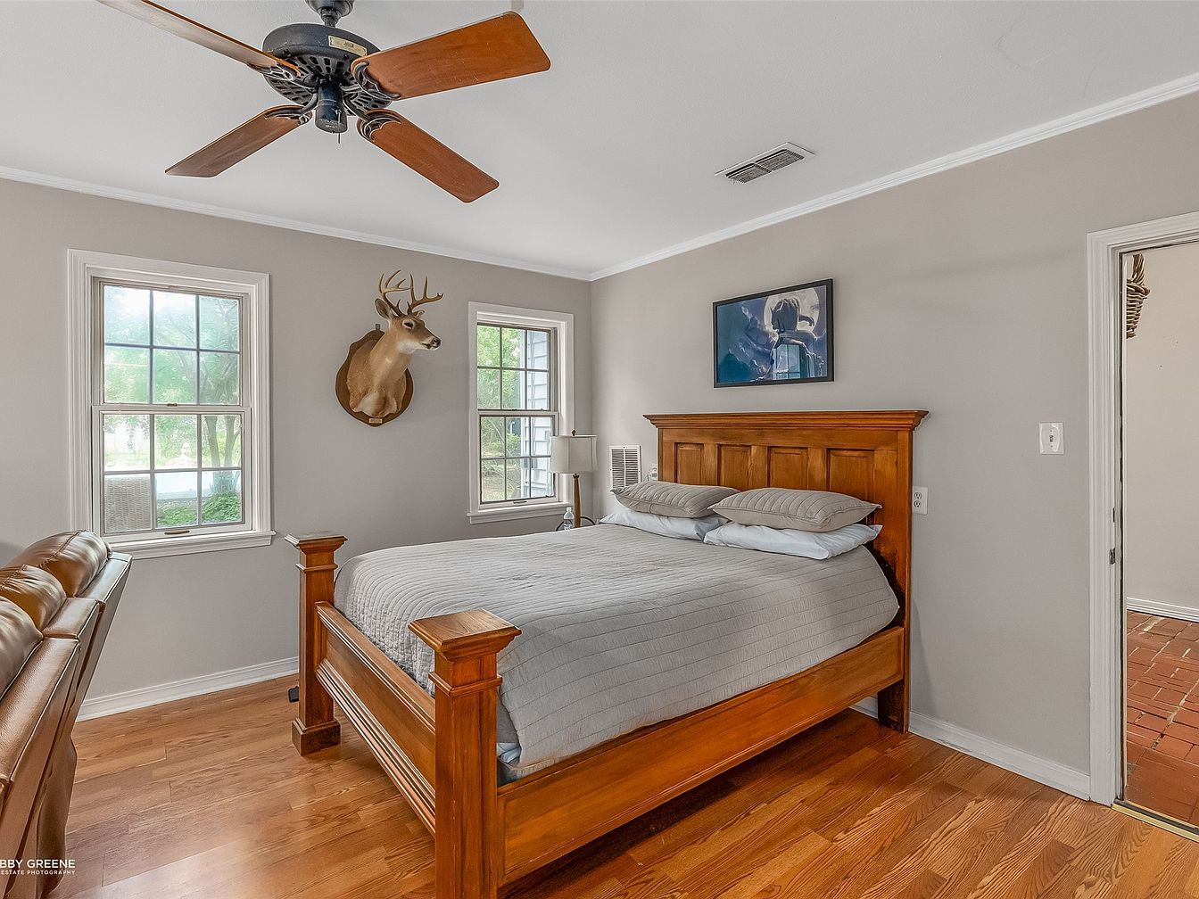 This serene bedroom features a classic wooden bed with a rich, polished finish, adorned with light gray bedding and multiple pillows. Soft beige walls complement the warm hardwood flooring, creating a cozy atmosphere. Two large windows allow natural light to flood the space, with a framed photograph adding a personal touch on the wall. A mounted deer head enhances the rustic charm, while a bedside lamp provides additional lighting. The room also includes a tasteful leather seating area, emphasizing comfort. Architectural details like crown molding and the ceiling fan contribute to a warm, inviting aesthetic.